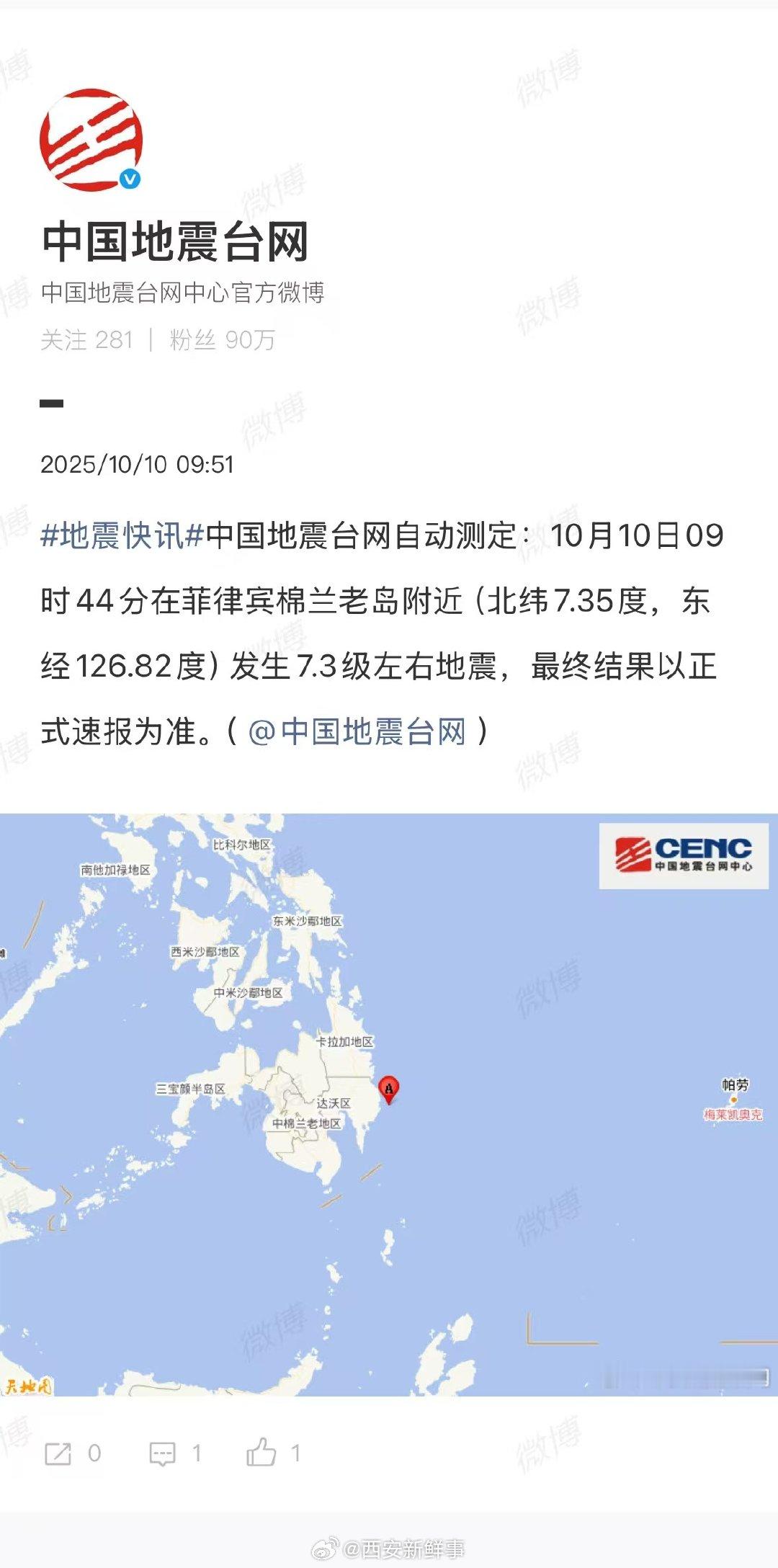 【菲律宾7.3级地震】菲律宾棉兰老岛附近7.3级地震10月10日,:中国地震台网