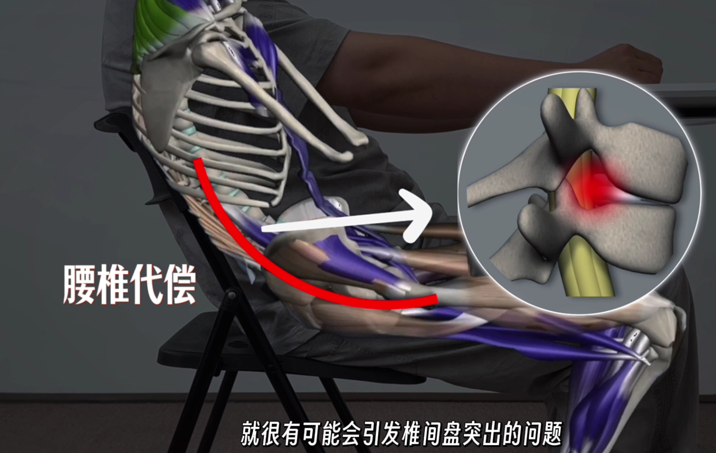 因为我们正常坐着时候,需要髋关节屈曲和骶髂关节活动度,由于骶髂关节和髋关节活动度受限,造成腰椎屈曲代偿,长时间容易诱发椎间盘突出。
