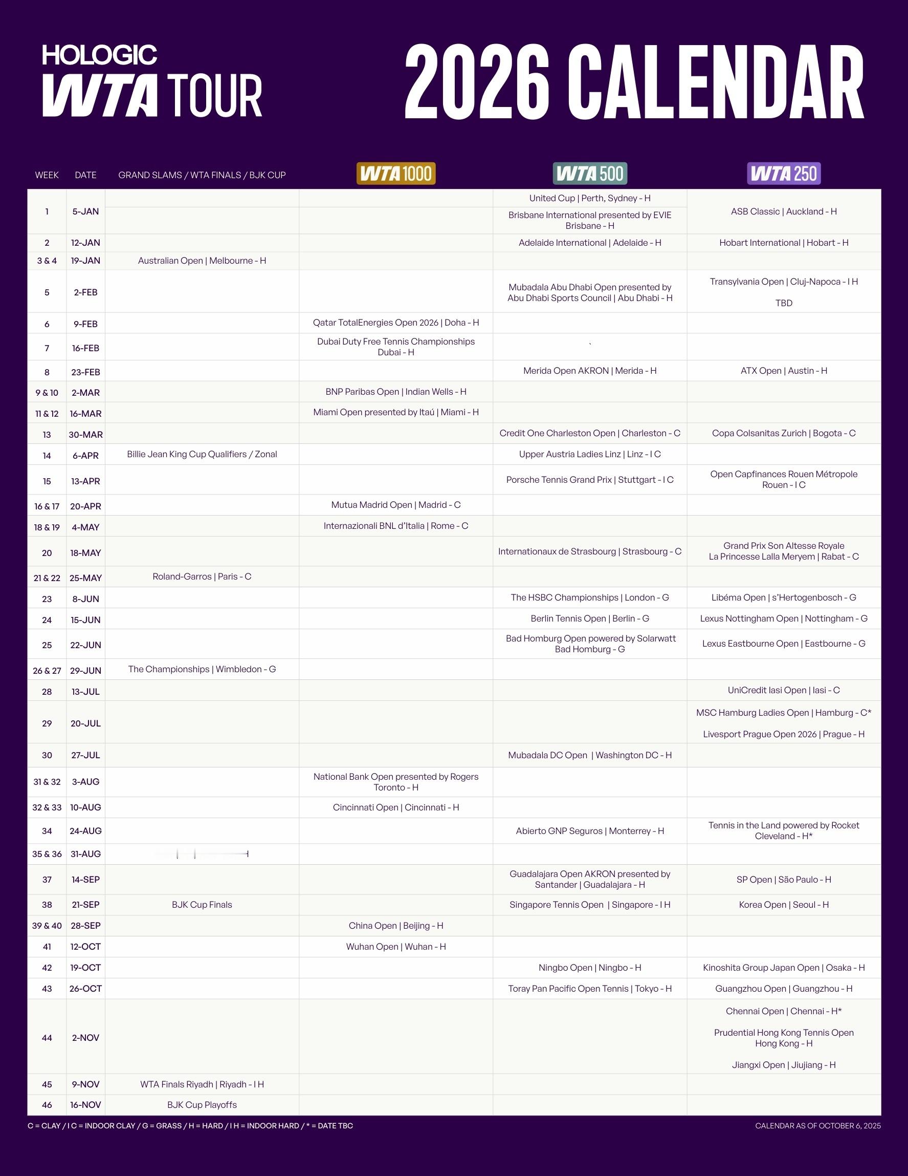 WTA公布2026赛季的赛历有一些新变化⬇️(欢迎补充,可能有遗漏)