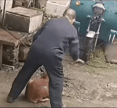 这个老头下手真是够狠毒的了,当看到这个只毛孩子的第一眼,就感觉这是一个非常温顺的毛孩子,它似乎没有犯什么大的错误,但却遭到这个老头子致命性的毒打,这就是想要了它这条狗命,看到这样的画面,心里真的受不了,首先可以肯定的是,这不是一条流浪狗,因为它的身上拴着链子,一个身上有链子的狗,主人为什么要如此对待它?但凡有一点悲悯之心的人,是下不了这个手的,这个老头绝对不是个善茬子,跟这人的相处,要加小心!