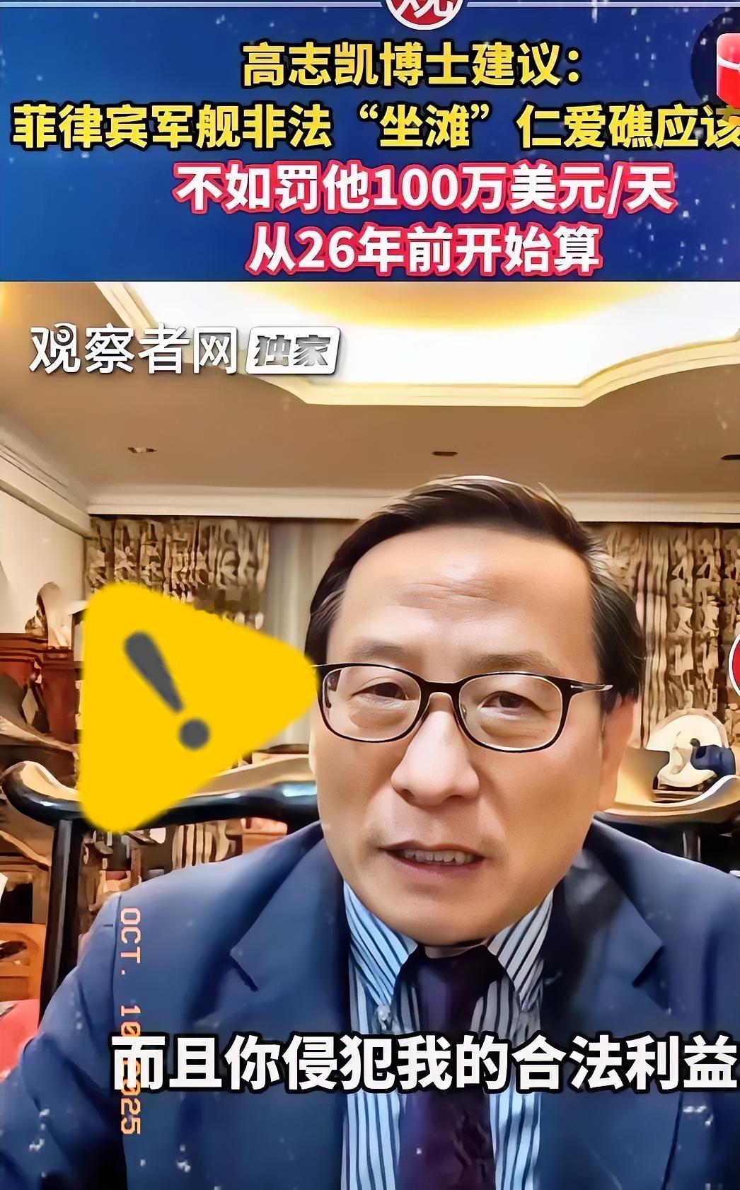 万万没想到 浓眉大眼的你也能有这种提议 学者高志凯有个新提议,菲律宾那艘在仁爱礁赖了二十六年的破船,得罚它每天一百万美元,从坐滩那天算起。 这笔账算下来可了不得,二十六年的滞纳金,足足能堆出近九十五亿美元的天文数字。有网友调侃,要是换成人民币结算,说不定还能给个“友情价”,大概六百六十五亿。 高志凯可不是随口一说,他那耶鲁法学博士的底子,加上在联合国和外交部历练过的眼光,摆明了是要用国际法认可的尺子,去量一量马德雷山号这坨锈迹斑斑的“牛皮癣”。 回头看看一九九九年五月九号,美国轰炸我南联盟大使馆的第二天,菲律宾趁乱把这艘二战老舰开上仁爱礁,演了一出“技术故障”的戏码。他们嘴上说着“零件一到就拖走”,身体却很诚实,一赖就是二十六年。珊瑚礁上硬生生插进个铁疙瘩,这哪是坐滩,分明是强行碰瓷。 更可气的是,他们一边享受着中方出于人道主义允许的食物淡水补给,一边偷偷往船上运水泥钢材,盘算着把临时搁浅搞成永久占领。这不就像把辆破车扔你家车位,还时不时过来偷偷加固,想把它变成自家车库?中国人的克制与耐心,反倒被当成了可钻的空子。 这艘破船带来的不只是主权挑衅,更是一场生态灾难。自然资源部的调查报告写得明明白白,军舰周边的海水里重金属、油污超标,珊瑚大片死亡,那片本该蔚蓝的海域被糟蹋得不成样子。菲律宾那些高调环保的姿态,在自家制造的污染证据面前,显得无比讽刺。 最近仁爱礁更是风高浪急。菲律宾那边,上将少将轮番放话,拉着美国、澳大利亚的舰机搞联合军演,摆出“决战”架势。我们这边,二十多艘海警船严阵以待,直8直升机在头顶盘旋,一场实弹演习直接亮出底线。那艘南拖185中型拖船就在五公里外盯着,仿佛在问:你这破船,还打算锈到什么时候? 高志凯这把“法律尺子”捅破了窗户纸。它告诉所有人,主权侵犯是有价的,破坏环境是要赔的。这不是简单的口水仗,而是用规则博弈的战略定力。那艘破船终将解体于风浪,但它在国际法理上欠下的债,一分别想赖掉。 各位读者你们怎么看?欢迎在评论区讨论。
