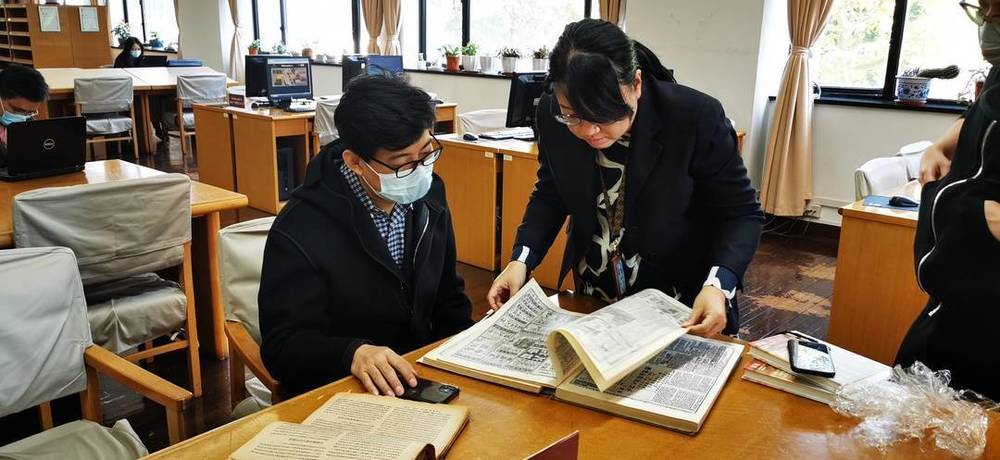 祝勇(左)在上海图书馆查阅关于故宫文物南迁的文献资料(祝勇提供图片)