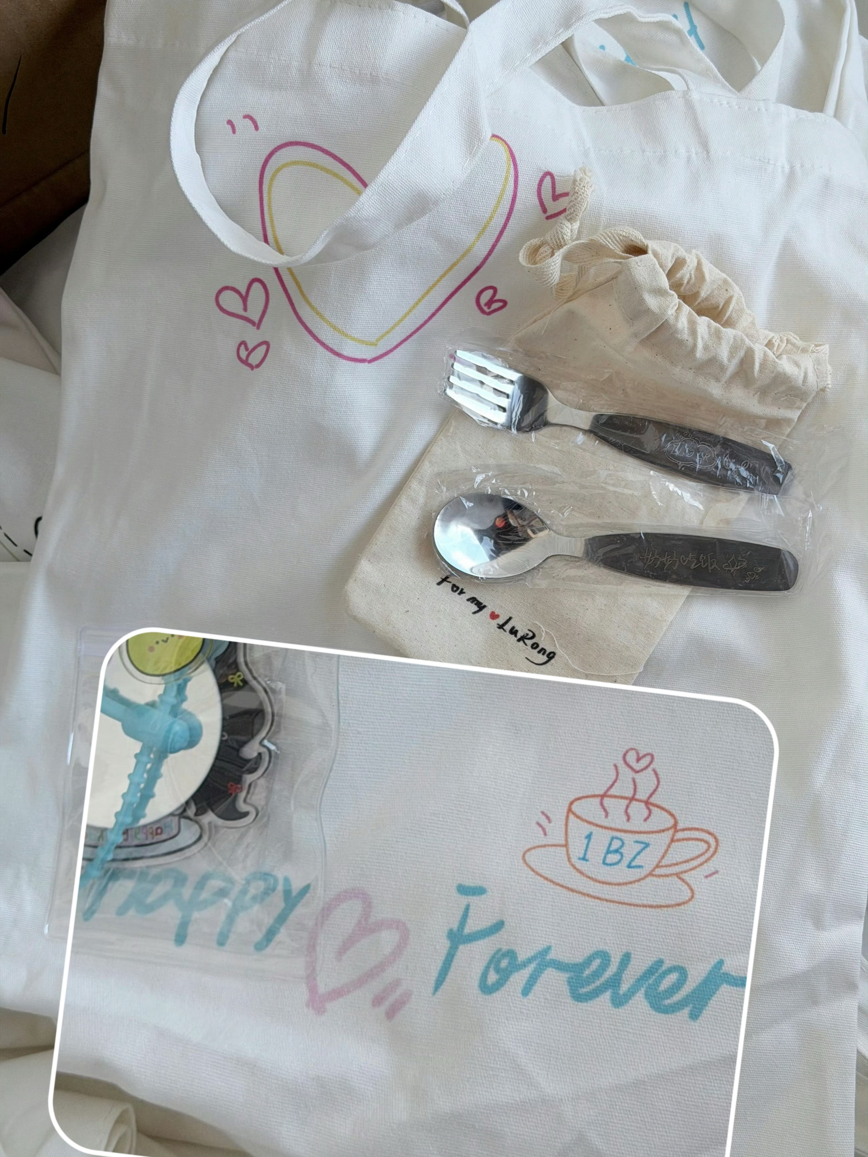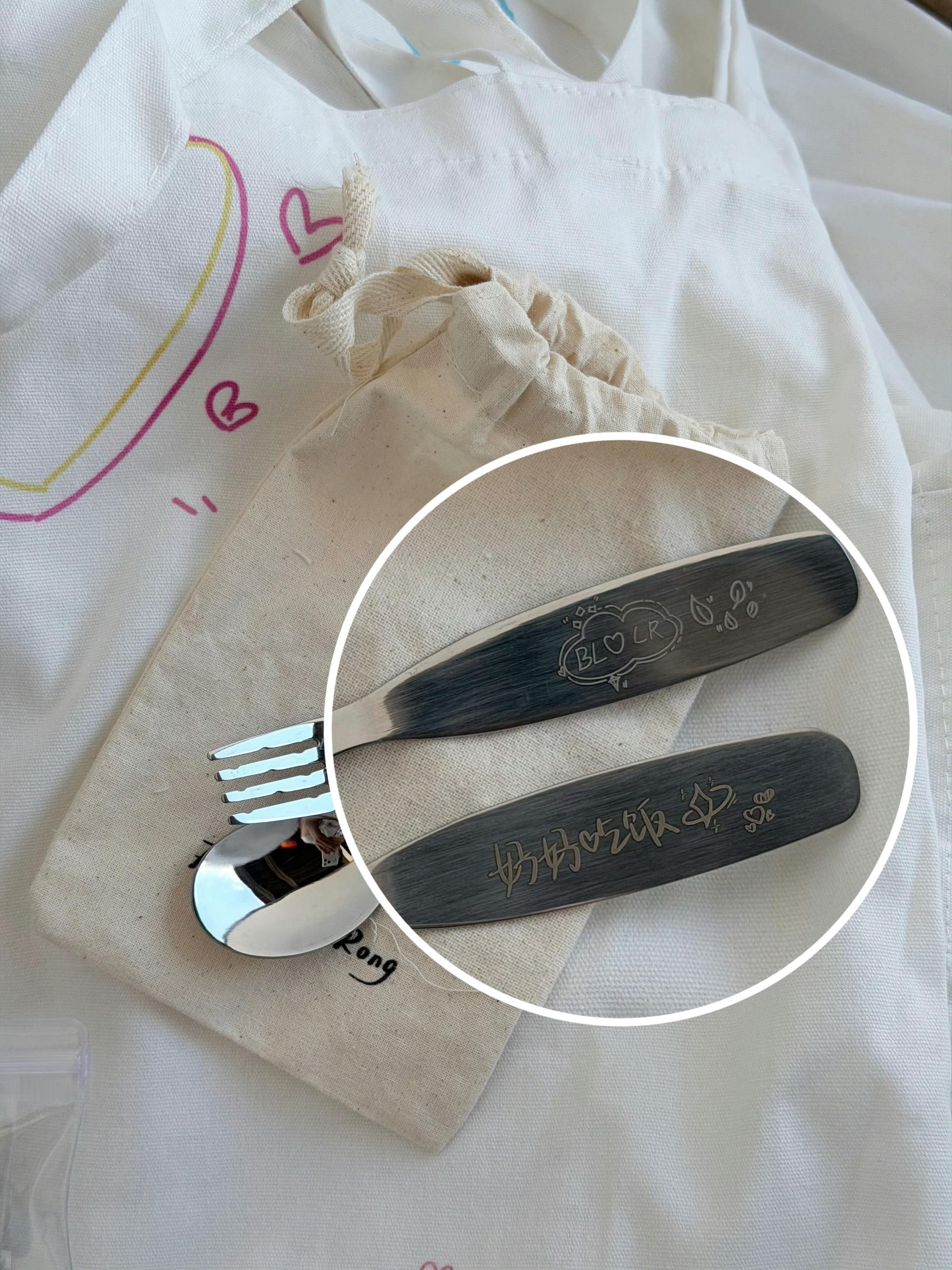 刀叉也是定制的 上面都是白鹿自己的字写着“BL🩵LR”“好好吃饭” 可爱的🍃涂鸦和爱心