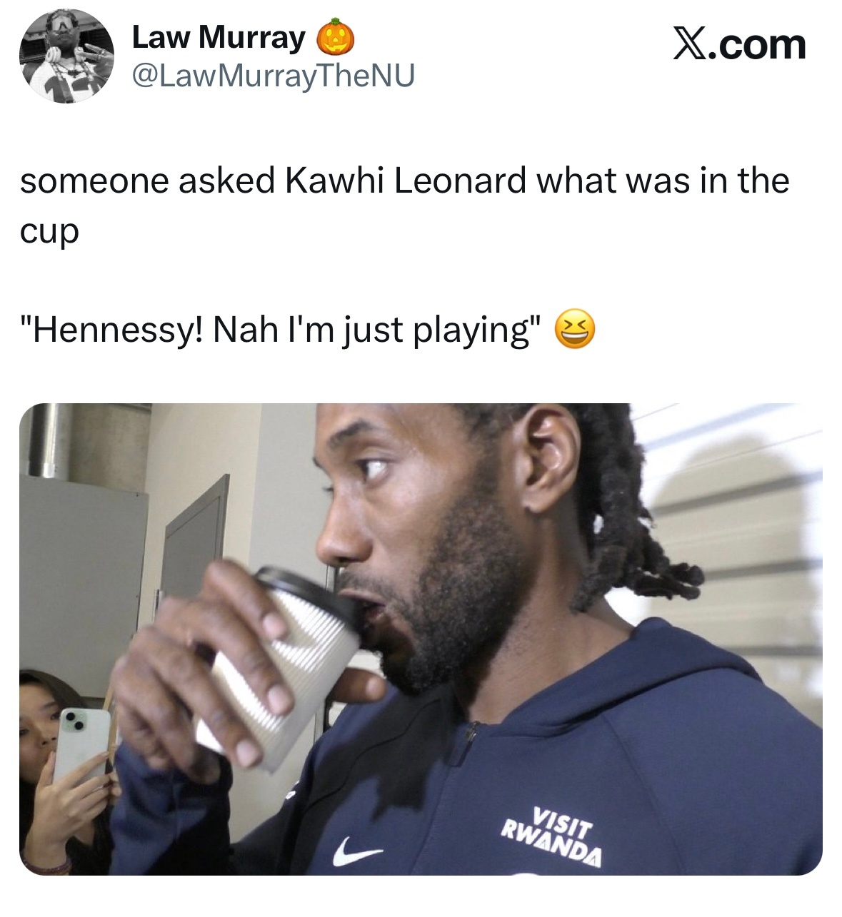 哈哈,都开始玩梗了!有人问伦纳德杯子里装的是什么?他回答:“轩尼诗!哎呀,我开玩