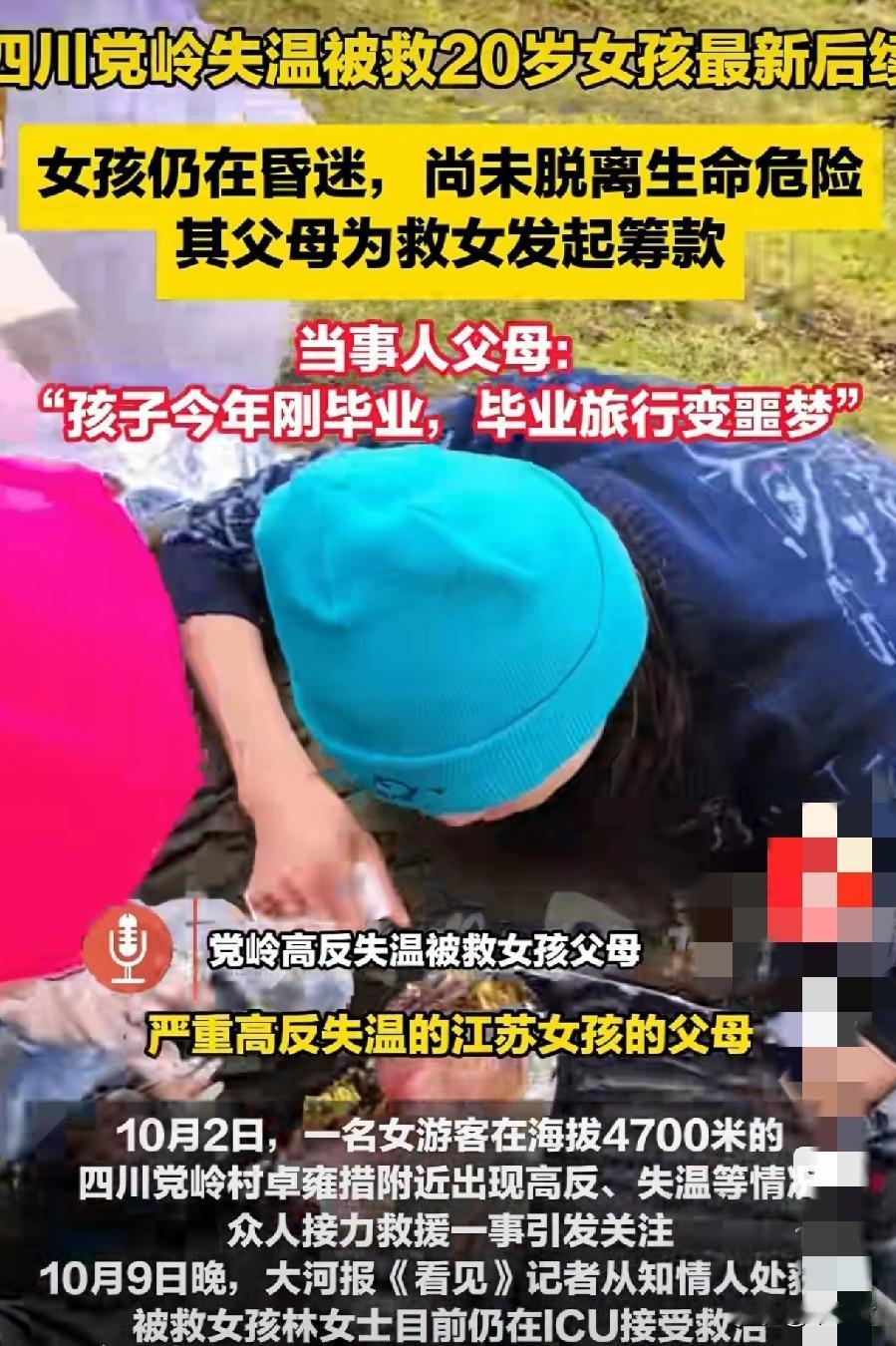 还记得这个党岭“失温”女孩吗,回来以后仍然在ICU昏迷,父母现在在筹集药费,请求广大网友支持和帮助。 这种同行的算不算有责任呢,一同去,半路扔在路上,全靠热心好人,全程照顾和背下山回家,如今孤零零躺在病床上,一个人承担所有。 很多网友说女孩是去旅游,并不是传统意义上的需要救助,这种情况应该自行承担,或者找当初一起去的搭子承担。 现在旅行捡回一条命都算福大命大了,还是遇到这么多好心人的帮助下才能回家。如今还要广大群众为她的旅游,所谓自己的毕业礼物之行买单,很多网友表示不接受。 一次旅行,不充足的准备,却没想到有这样的结果,又是刚毕业的学生,没有长途跋涉的经验,直接去到一个这么远还带有高原反应的地方,实在是对自己太不负责了。 (图片来自网络视频)