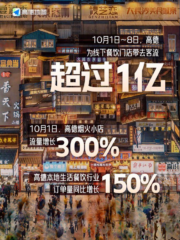 数据同样亮眼——10月1日高德APP活跃用户数突破3.6亿创历史新高,“烟火小店”流量暴涨300%,餐饮订单量同比提升150%,全国TOP100餐厅人均消费仅83元,真·“好吃不贵”。
