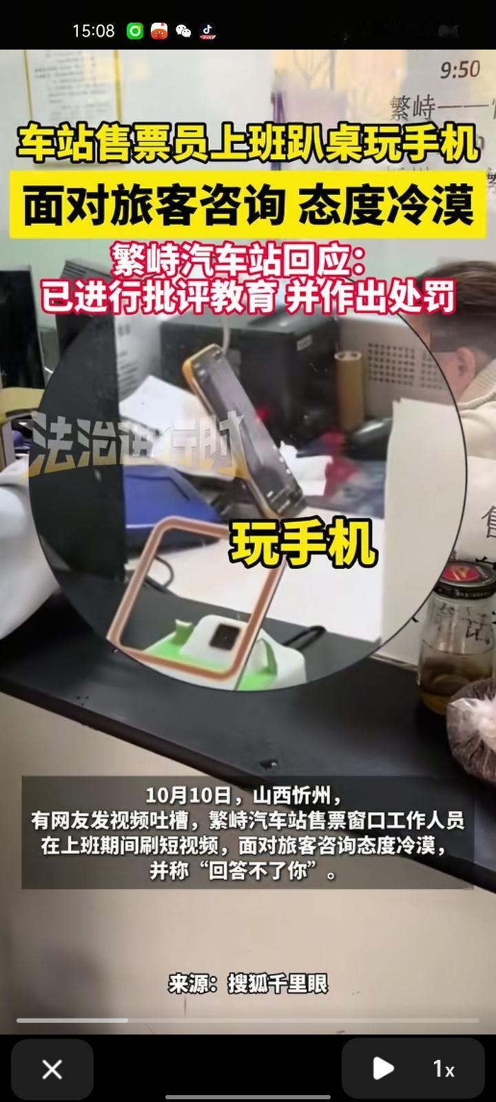 10月10日,忻州市繁峙县。网友发视频吐槽称,繁峙汽车站售票窗口工作人员上班时间玩手机,面对旅客咨询态度冷漠,还说“我回答不了你”。汽车站回应称,已对涉事工作人员进行批评教育,并做出处罚。 公共服务岗位的职责是为群众提供帮助的,即使问题超出个人权限,也应该引导到能解决的渠道,而不是一句“回答不了你”就了事。而且上班时间玩手机会影响工作效率,还可能让服务对象觉得被忽视,生气走了。