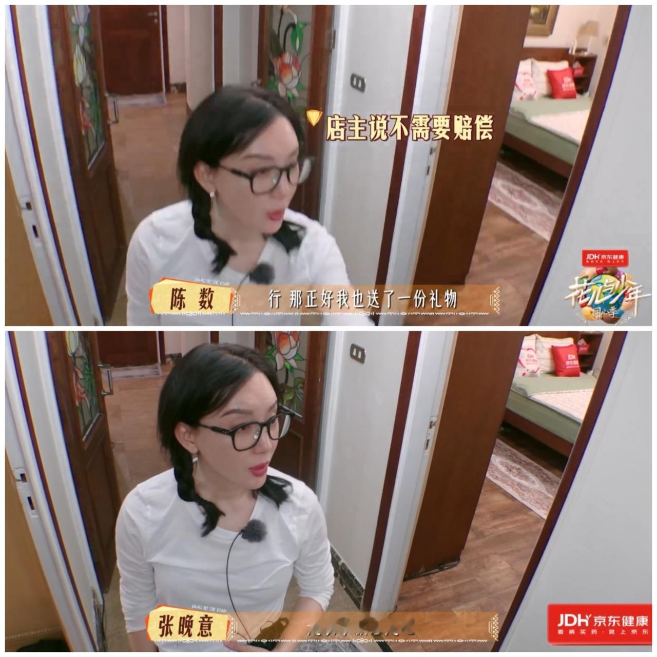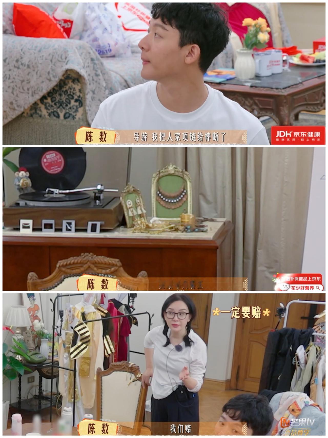 陈数把民宿的项链咔嚓一下摔断, 张晚意连忙跟民宿老板沟通赔偿细节, 紧张等待回复。 陈数不小心摔断的项链很明显 就是陈数放在头上拍小考视频的那条。 当时陈数头戴围巾 直接把项链放在头顶围巾上, 围巾质地那么滑, 这个项链滑下来摔在地上 很正常呀。 我看她拍那个视频时, 还替她担心这个项链是否会滑下来呢? 这下好了, 这个项链果真从头顶滑下来摔断了。 人家项链本来是用来戴在脖子上的, 陈数偏偏要把它放在头顶, 能不摔下来吗? 那么小的东西, 有的民宿顾客不说, 把项链假装完好的摆回原位, 老板不细心检查是发现不了的。 但是陈数主动承认错误, 提出要赔偿。 一方面陈数不是那种逃避责任的人, 另一方面那么多摄像头对着, 不承认也不行呀。 陈数也不是差钱的人。 幸好民宿老板强调这个项链 就是提供给顾客拍照用的, 大方表示不需要赔偿。 但是陈数还是给老板送了一个礼物 表示歉意。 哎呀, 之前导游小丽说埃及的很多东西都是中国制造, 这个项链说不定就是中国义乌产的小东西, 就是一个拍照的道具, 值不了多少钱, 不然民宿老板也不会把它摆在客厅中间, 真的不怕人家偷呀。 不过这个民宿老板真的挺不错的, 给他们准备了很多中国调料, 还给他们7人每人一个告别礼物。 民宿老板接了这个花少团, 表现那么友好与暖心, 节目结束, 就等着接住泼天的富贵吧。