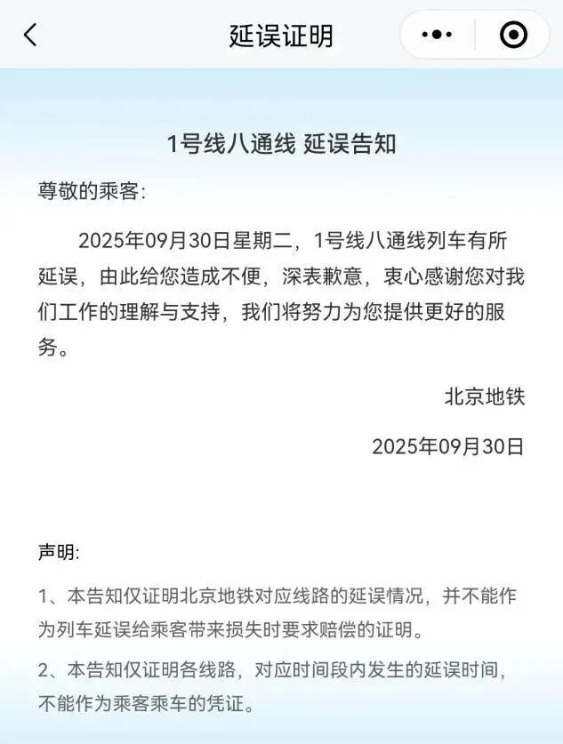 【网友凭地铁延误证明免迟到,客服:证明仅作情况说明,采纳权在单位】近日,有北京网友在社交平台分享经历称,因早高峰地铁延误近20分钟,她在地铁站成功开具“延误说明”并提交单位,最终未被记为迟到。对此北京地铁回应,若乘客确因地铁故障导致上班延误,可向站点工作人员申请获取延误证明。但地铁方同时强调,该证明能否作为免于迟到的依据,最终决定权在乘客所在单位。 图/网络截图 10月9日,经视直播记者联系到该网友进一步确认,其在延误发生后咨询地铁工作人员,顺利取得纸质延误证明,所在单位经核验后认可该情况属非个人原因导致的迟到。 记者以市民身份致电北京地铁客服。对方回应称,事发当日地铁1号线确实发生故障,乘客可通过两种方式获取证明:一是在1号线八通线任意站点出站时向工作人员领取纸质版;二是通过“北京地铁”APP首页“延误证明”入口,在线下载当日电子版证明。 图/来源北京地铁 客服人员提醒,延误证明一般仅公示10至15天,建议乘客及时下载保存。至于该证明是否可作为免迟到依据,工作人员表示,多数乘客开具此证明是为说明迟到非个人责任,但最终是否采纳,仍取决于乘客所在单位的规定。 此事引发网友讨论,有人询问“公交是否也可开具类似证明”,也有人指出“证明的核心在于说明非个人责任,但单位是否认可仍是关键”。 针对地铁延误证明的法律效力与单位采纳的合理性问题,湖北炽升律师事务所李经昕律师表示,地铁公司出具的延误证明具备真实性与合法性,可作为非个人原因导致延误的有效凭证。 “单位认不认可地铁延误证明,都有其合理性。”李经昕分析,当前交通工具多样,共享单车、公交、网约车等均可选择,员工对通勤方式有自主决定权,若因选择地铁延误导致上班迟到,单位不认证明、按规定记迟到,并不违背法律法规;而单位若采纳证明,则体现了对员工通勤实际情况的人性化考量。