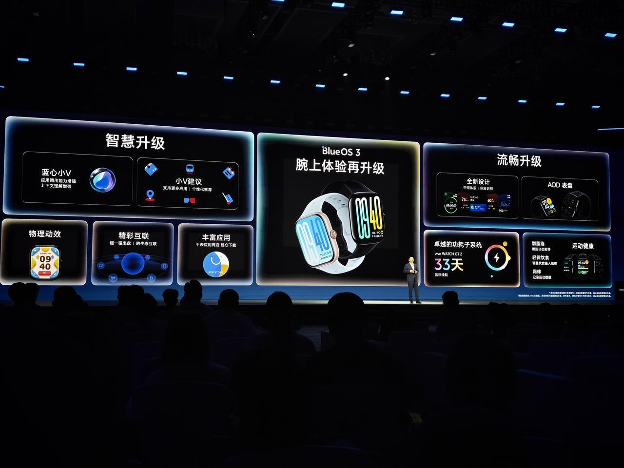 vivo为了带来更好的用户体验,启动了舒适工程,今年优化了1500+个问题。 凭借深厚的技术积淀,带来了「有史以来最流畅的OriginOS」 (蓝河操作系统做了3年,自研技术深耕了8年) OriginOS6 vivo X300系列首发 【流畅】 OriginOS6首发蓝河流畅引擎,实际这个大家应该并不陌生,就是将异构计算空间,存储融合,虚拟显卡等能力进一步融合升级。 实测,把当年的X90装上新系统,流畅度可以带来明显提升。 除了系统层性能优化,还加入全新系统动画:弹性动效,带来操控的强反馈与连贯性;帧模糊,动画切换时更自然;一镜到底动效,从哪来到哪去,拒绝割裂感,更连续;帧形变,让动画更符合自然的效果,视觉上更顺畅。 体验流畅,秒抢引擎再升级,除了演唱会、苏超门票,还加入抢医院专家号,以及刷短视频等场景流畅度。 【设计】 直觉设计,全新光影空间,全新个性时钟,趣味光栅,堆叠卡片/通知。 【感知舒适】 视觉舒适,AI全场景亮度仿生,调节更智能更懂你;晕动视觉辅助,缓解看手机晕车。 听觉舒适,天玑9500平台也可支持HiFi级TWS;自研虚拟扬声器,提升外放音效;音量调节升级到150级,可以更好的调节到自己想要音量。 触感舒适,低于40ms的振动零时延感知,游戏振动反馈更舒适;振动个性化调节支持51级设置。 AI网络智选3.0,电梯场景优化,宿舍多人游戏稳定优化,出镜上网优惠套餐更优惠。 【蓝海续航系统升级】 场景能效2.0/异构计算3.0/全局直驱供电2.0/微电精灵2.0(可实现插电满血复活)。 【AI】 超高效的小V圈搜2.0,更好用的小V记忆2.0,AI总结(对手机中邮件/文件生成摘要),智能命名(新建文件,帮你生成接近主题的文件名),AI搜索,小V电话助手2.0,AI修图大师(根据浏览内容自动推荐AI功能),LivePhoto AI消除。 【连接】 智能车载,小V一句话控家,摇一摇一对多分享(支持苹果),vivo办公套件登录iPad。 【蓝河操作系统3】 主要服务于眼镜、机器人等设备操作系统。 蓝河相机框架,原生支持视觉识别与空间计算等AI能力。 蓝河音频框架,并行唤醒机制,提升听觉识别能力,令AI音频信息获取更准确。 感知唤醒,智能眼镜秒级开机。 搭载蓝河设备将拥有蓝心小V,蓝心智能体全功能。 天生流畅、天生长续航、天生安全。 蓝河内核开源,正在申请开源基金项目。 蓝河操作系统创新赛开启。 iQOO WATCH GT 2首发搭载。