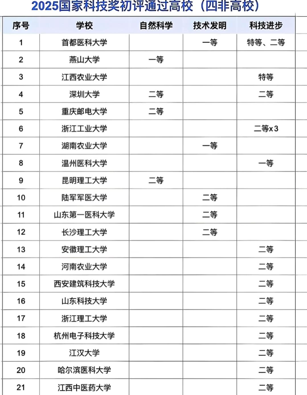 别纠结“双一流”头衔了,这些四非高校拿国家科技奖拿到手软! 一提到国家科技奖,很多人觉得只有“双一流”高校才能上榜。但看了2025年国家科技奖初评通过的四非高校名单,才发现不少非“双一流”高校的科研实力早已超出想象。 首都医科大学这次太亮眼了,不仅拿下技术发明一等奖,还冲击科技进步特等奖。要知道,科技进步特等奖的分量极重,涉及防聋治聋这样的民生领域,直接造福无数患者。这所非“双一流”医科大学,在医学科研上的突破,丝毫不输顶尖名校。 燕山大学的“比天然金刚石更硬、更韧材料的设计与创制”获得自然科学一等奖,材料领域的突破能带动多少产业升级,想想就知道。江西农业大学的华系种猪育种技术拿下科技进步特等奖,种业是农业的“芯片”,这所高校在保障国家种业安全上的贡献,意义非凡。 深圳大学在深部资源开采、超大规模基础设施巡检技术上的研究,拿下自然科学和科技进步两个二等奖。这些年深圳大学的科研投入和成果转化有目共睹,区位优势让它在工科领域快速崛起。浙江工业大学更是一口气拿下三个科技进步二等奖,从绿色农药到化工污染治理,再到大型构件激光制造,扎根产业解决实际问题,这样的科研态度太扎实了。 湖南农业大学的杂交水稻高效制种技术、温州医科大学的重组细胞因子药物技术,都是各自领域的硬通货。还有陆军军医大学的超级细菌疫苗、哈尔滨医科大学的血管疾病诊疗技术……这些四非高校在医学、农业、材料、化工等领域的深耕,做出了太多“独门绝技”。 杭州电子科技大学的复杂场景视觉模型、重庆邮电大学的图像跨域生成理论,在人工智能领域也有自己的一席之地。西安建筑科技大学的特种钼合金制备技术、安徽理工大学的煤矿粉尘治理技术,在传统工科领域持续发力。 这些四非高校没有“双一流”的光环,却在各自的赛道上默默深耕。有的靠着行业积淀,在细分领域做到全国顶尖;有的靠着地域优势,搭上地方发展快车;有的则瞄准国家急需的“卡脖子”技术,啃下硬骨头。 “双一流”的头衔固然重要,但科研的价值从来不是靠头衔衡量的。这些四非高校用一个个国家级奖项证明,只要有实力、肯钻研,照样能在科研舞台上发光发热。 所以,你还觉得只有“双一流”高校才有科研实力吗?这些四非高校的表现,有没有改变你对高校科研的看法?双一流 科研榜单 全球科研排名 科研排名 南京双一流 科技学术奖 一流学科排名