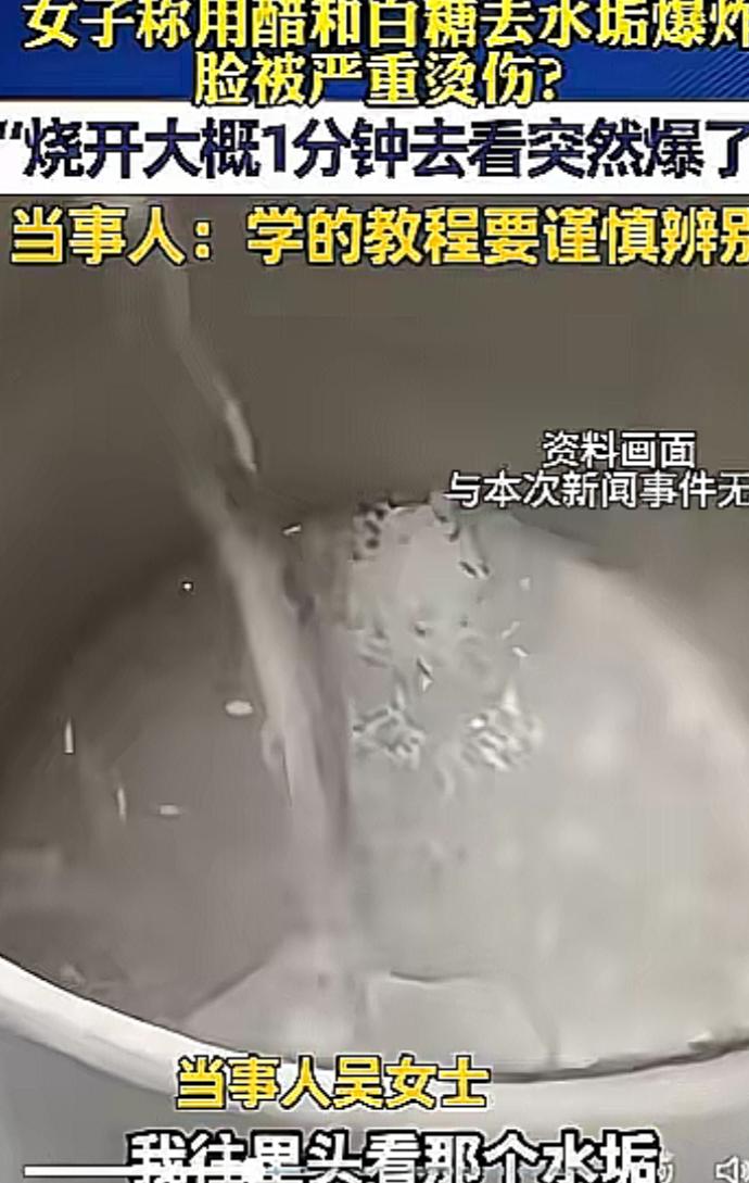 悲剧还是发生了!河北邯郸,女子为了去水垢,竟然直接将醋和白糖放进去烧,水开后1分钟,她揭盖想看看水垢还在不? 没想到刚打开盖子就直接爆了,热水都蹦到女子脸上了,直接造成烧伤了。 加糖纯属多余,只用醋泡就行,现在网上多少人都没有一点安全常识,就在这乱科普,醋和水垢反应会冒二氧化碳,密闭的壶里气排不出去,压力一高就容易爆沸 。 还有之前有人用小苏打混白醋清油烟机,结果喷瓶直接炸了,还把手炸伤了,这些会产生化学反应东西还是小心使用。 安全才是第一位,这种没经过验证的偏方,真别乱实践,不然省钱变花钱,实在不行就在网上买专用的,至少没有危险。