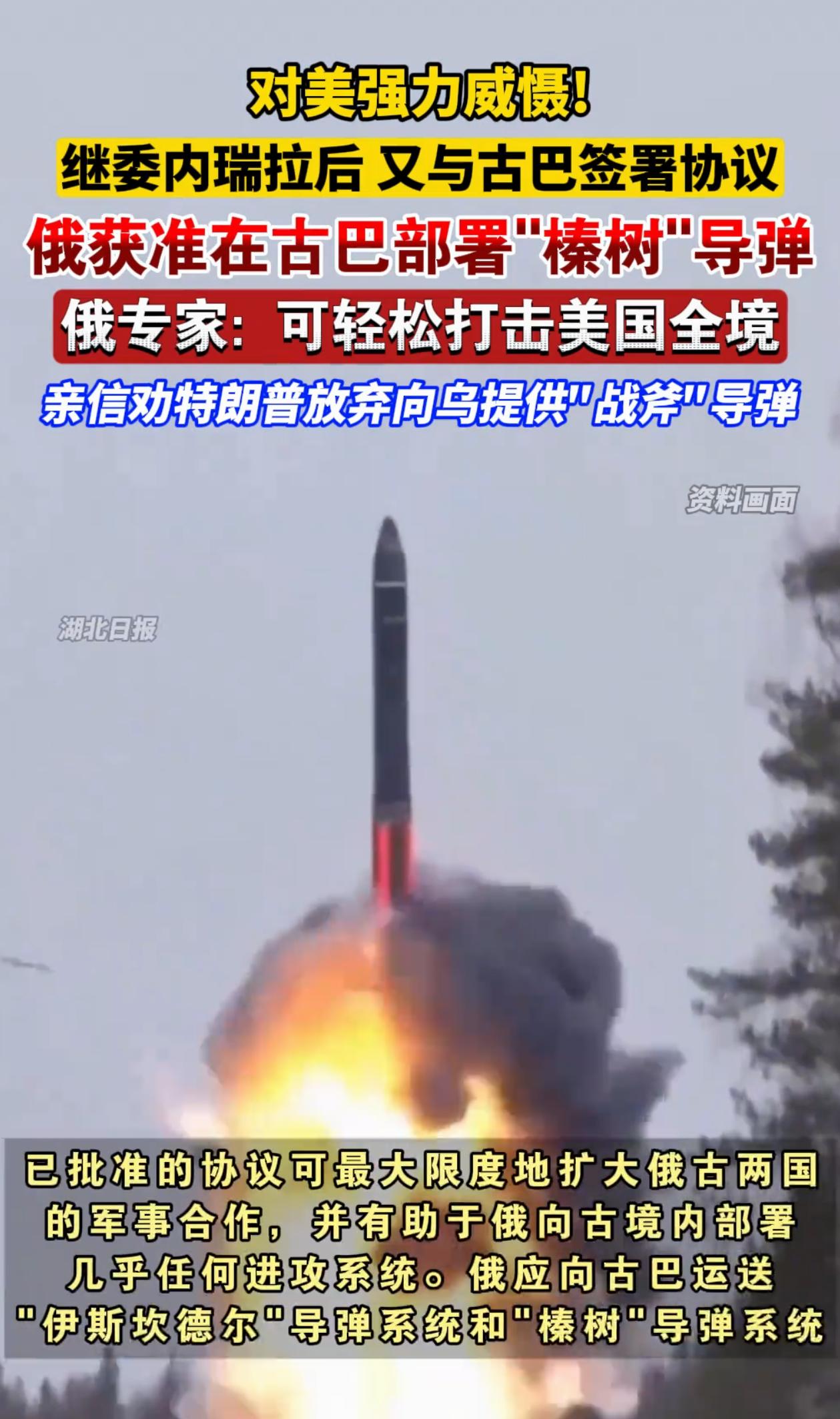 真的要见证S3赛季了!? 美国要向乌克兰提供“战斧”导弹,真把俄罗斯逼急了!俄罗斯宣布在古巴部署“榛树”导弹系统和“伊斯坎德尔”导弹系统,加上前几天俄罗斯与委内瑞拉签署了战略合作协议,俄罗斯直接把军事装备搬到美国的家门口,从古巴发射的导弹,很轻松就能打击美国境内的任何一个目标! 如果美国执意要在乌克兰部署“战斧”导弹,俄罗斯为保证战局的优势,必定要对老美强有力回击,按照俄罗斯时说打敢打的性子,没准真的要烧到美国本土上! 局势要大变了!