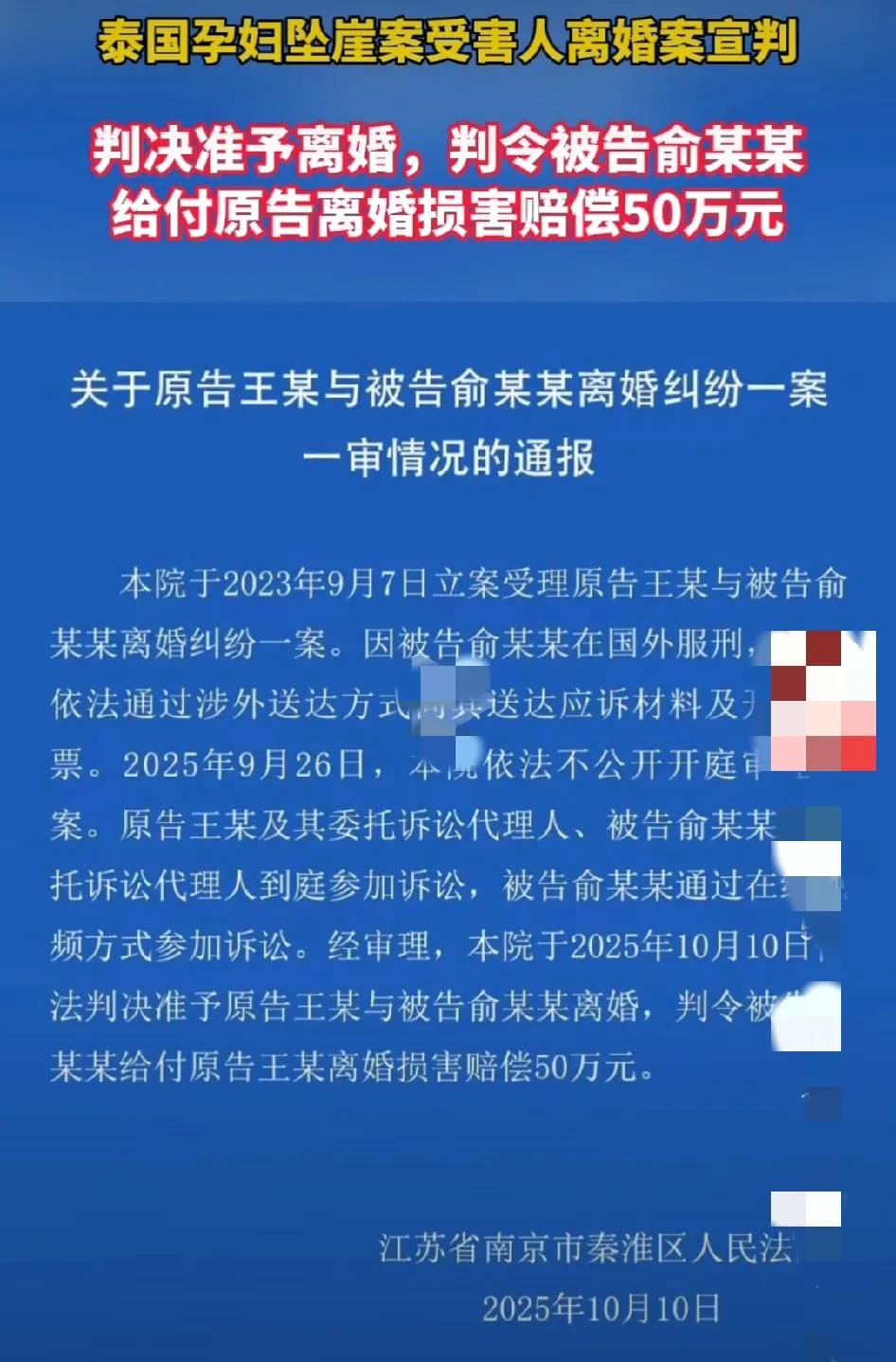 判决离婚挺好!女怕嫁错郎,男怕入错行!女不能嫁渣男,这是一场错误的婚姻带来的悲剧!给中国司法部门点赞! 据报道,王暖暖与俞某的离婚案于2025年10月10日由南京市秦淮区人民法院一审宣判,法院准予双方离婚,并判令俞某支付离婚损害赔偿50万元。 再有,由于被告俞某在泰国服刑,司法文书需通过涉外送达,且当事人无法出庭,法院采用在线视频开庭方式审理。此类跨国离婚案件在我国属首例,程序上缺乏先例可循。 另外,俞某的律师团队曾试图索要巨额财产分割,但法院最终判定赔偿50万元。王暖暖此前表示“必须迎难而上”应对拖延战术,体现出案件推进的艰难。 并且,这个案件历时6年,涉及跨国司法协作、证据调取等法律难题,凸显跨境司法合作的挑战。 总之,该案的判决体现了我国司法体系对特殊情况下当事人权益的保护,但程序复杂性和实际操作难度也反映出跨境案件的法律盲区。