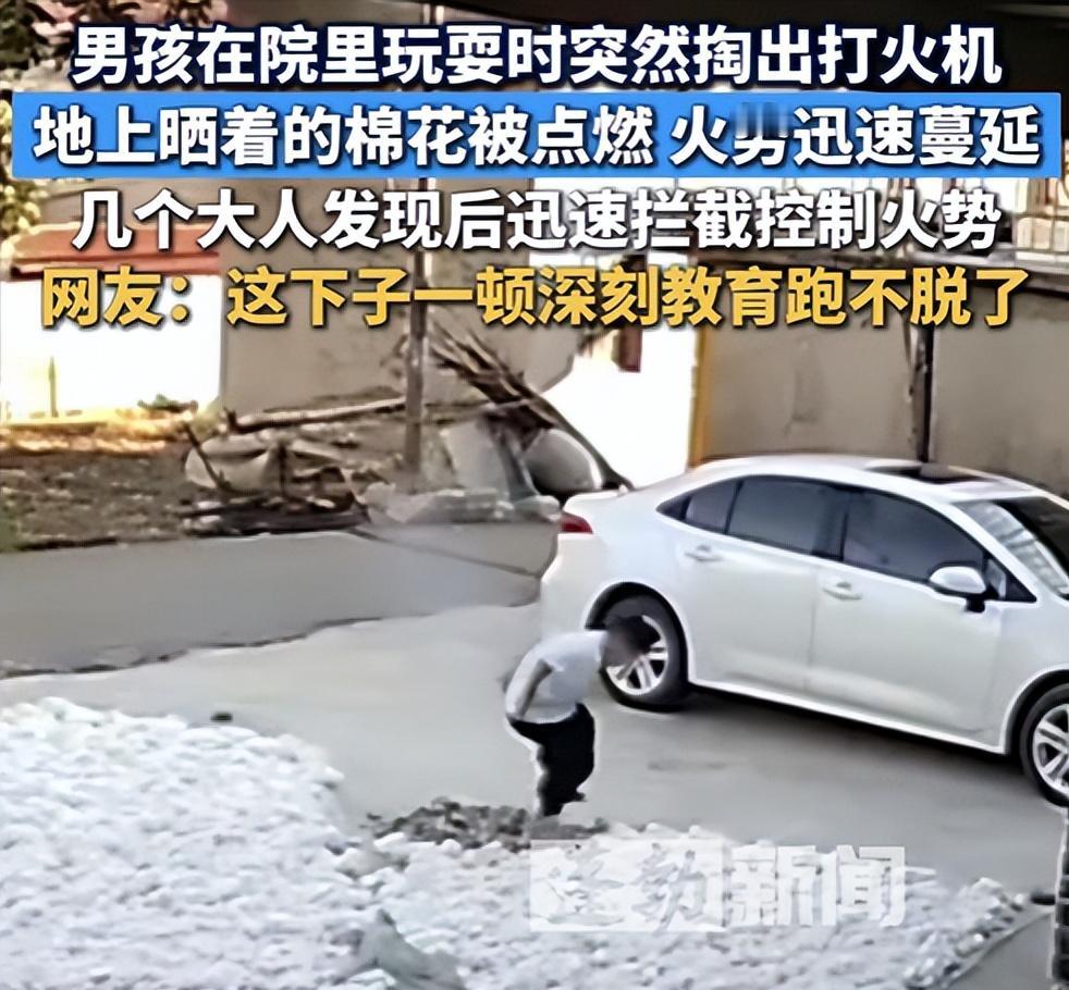 “咔嗒” 一声打火机响,广东院坝里的棉花瞬间窜火 —— 男孩先咧嘴笑,火裹到裤脚时,当场吓哭,这顿打他根本逃不掉! 当时大人路过,见他围着棉花蹦,只当是追影子玩,转身进屋的工夫,火星子就燎得棉花 “呼” 地烧起来。男孩慌得用鞋乱踩,眼看要全烧完了,才哭着喊 “着火了”。大人们冲出来拖棉花、总算灭了火,院坝里黑灰一片,男孩攥着烫得发烫的打火机,手都在抖。 网友吵翻了:“就得狠狠打!光说教没用,疼了才长记性”“别惯着,玩火闯祸不挨揍,下次敢点煤气灶”,也有人说 “小时候好奇”,可好奇不是闯祸的借口 —— 火能烧了院子,也能烧到他自己,不疼一次,哪能记住? 真该让他好好挨顿教训:不是虐打,是让他看着黑棉絮,疼着听清楚 “打火机不是玩具,烧了东西得自己扛”。家长别心软,这顿疼记住的,是往后不碰火的保命课,比十句 “别玩火” 管用。完整童年从不是闯祸不挨罚,是疼过之后,再也不敢拿危险当玩笑!