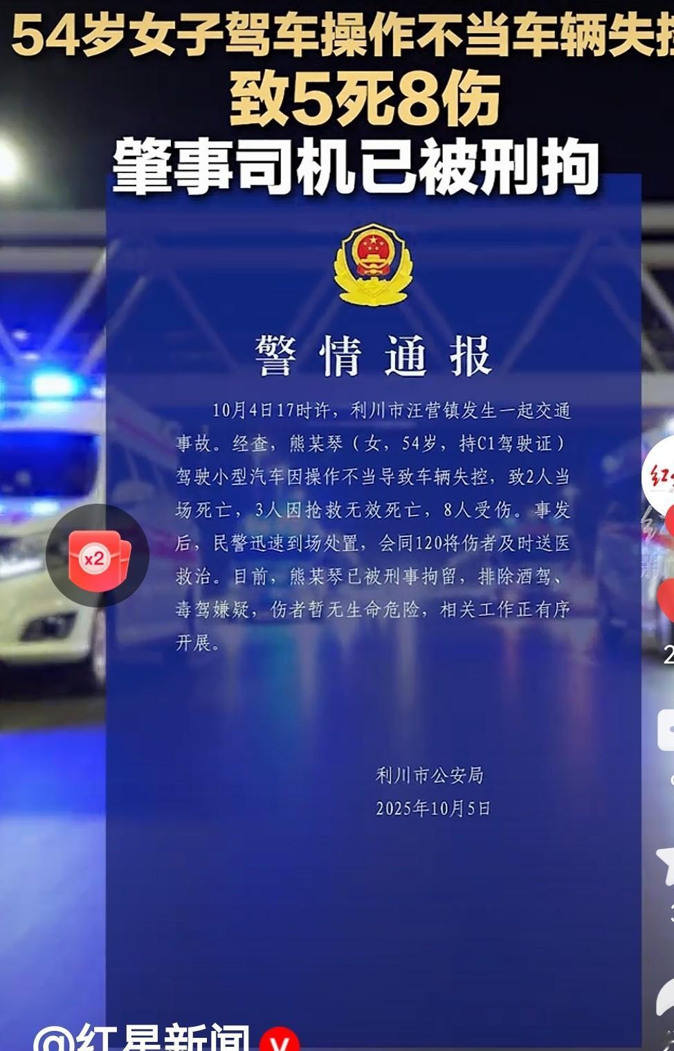5死8伤 把肇事者全家卖了都不够赔的 54岁了 还开啥车 打车不香吗 这下害人害己了 关键是在节日期间 那么多人枉死 使那么多家庭陷入巨大的悲痛中 奉劝年龄大了就被开车了 尤其是女同志