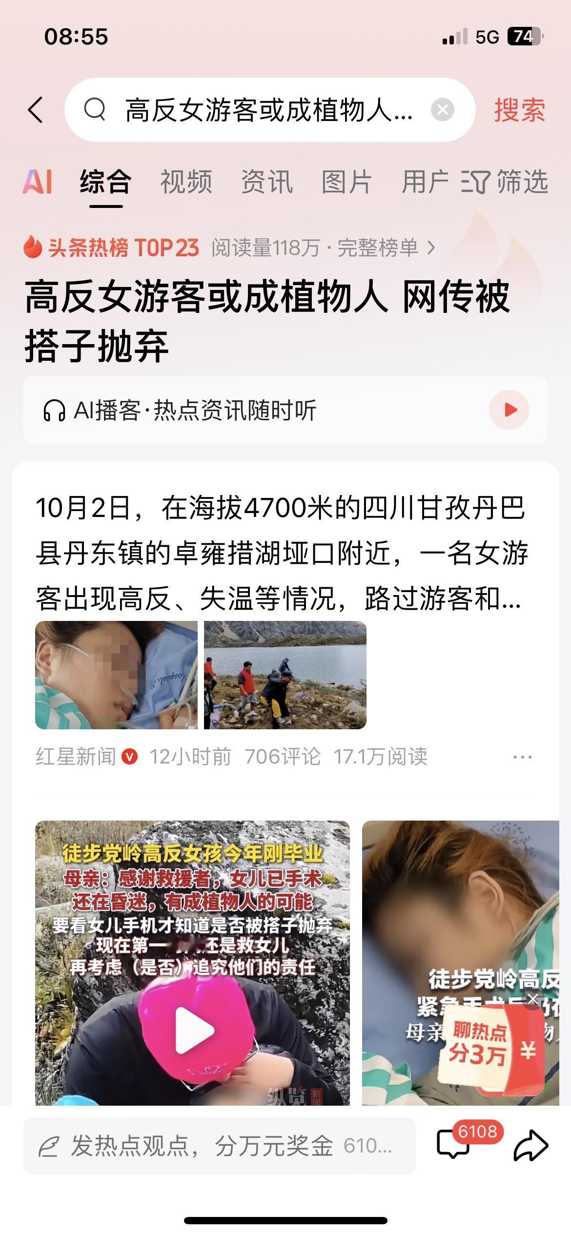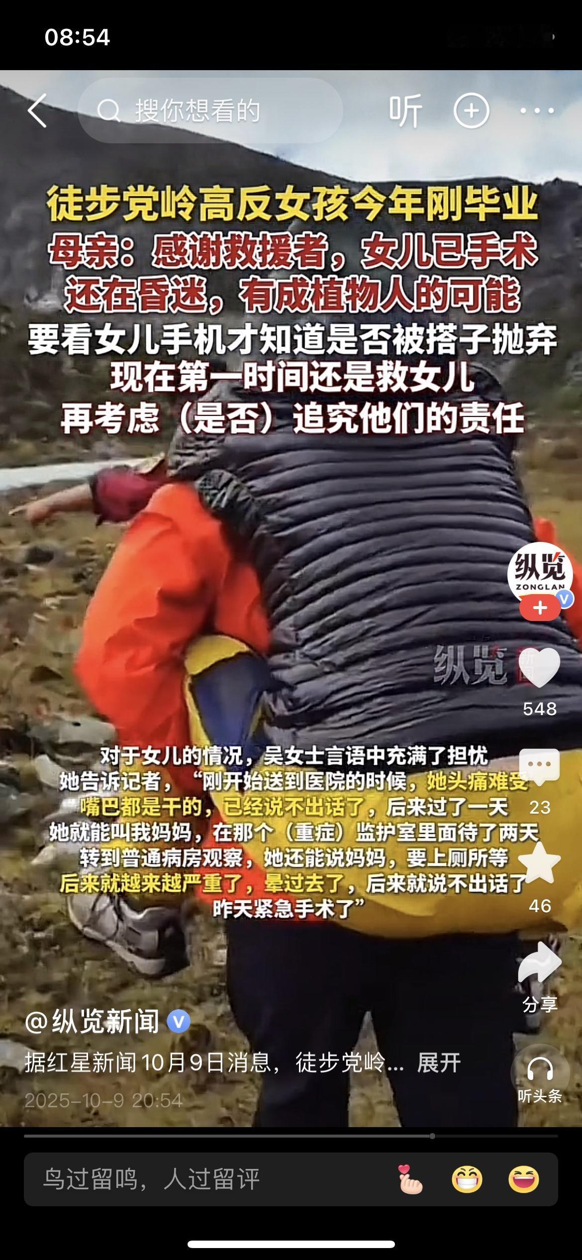 刚毕业女孩高反昏迷或成植物人,网传被搭子抛弃,母亲:先救女儿再追责 宝子们,最近看到一个让人揪心的新闻。 四川甘孜海拔4700米的地方,一个今年刚毕业的女孩徒步时高反、失温,现在还在昏迷,有成植物人的可能。更让人揪心的是,网传她被同行的搭子抛弃了,现在她妈妈说要先看女儿手机才知道真相,当下最重要的是救女儿,之后再考虑要不要追究责任。 好在当时路过的游客、当地警方、镇政府工作人员和医务人员接力救援,把女孩送下山送进了医院。她妈妈也很感谢这些好心人,说没有他们情况可能更糟。 这事儿真的太让人唏嘘了。你们怎么看户外搭子这种关系?遇到这种情况,你觉得搭子该承担责任吗?评论区聊聊你的看法~