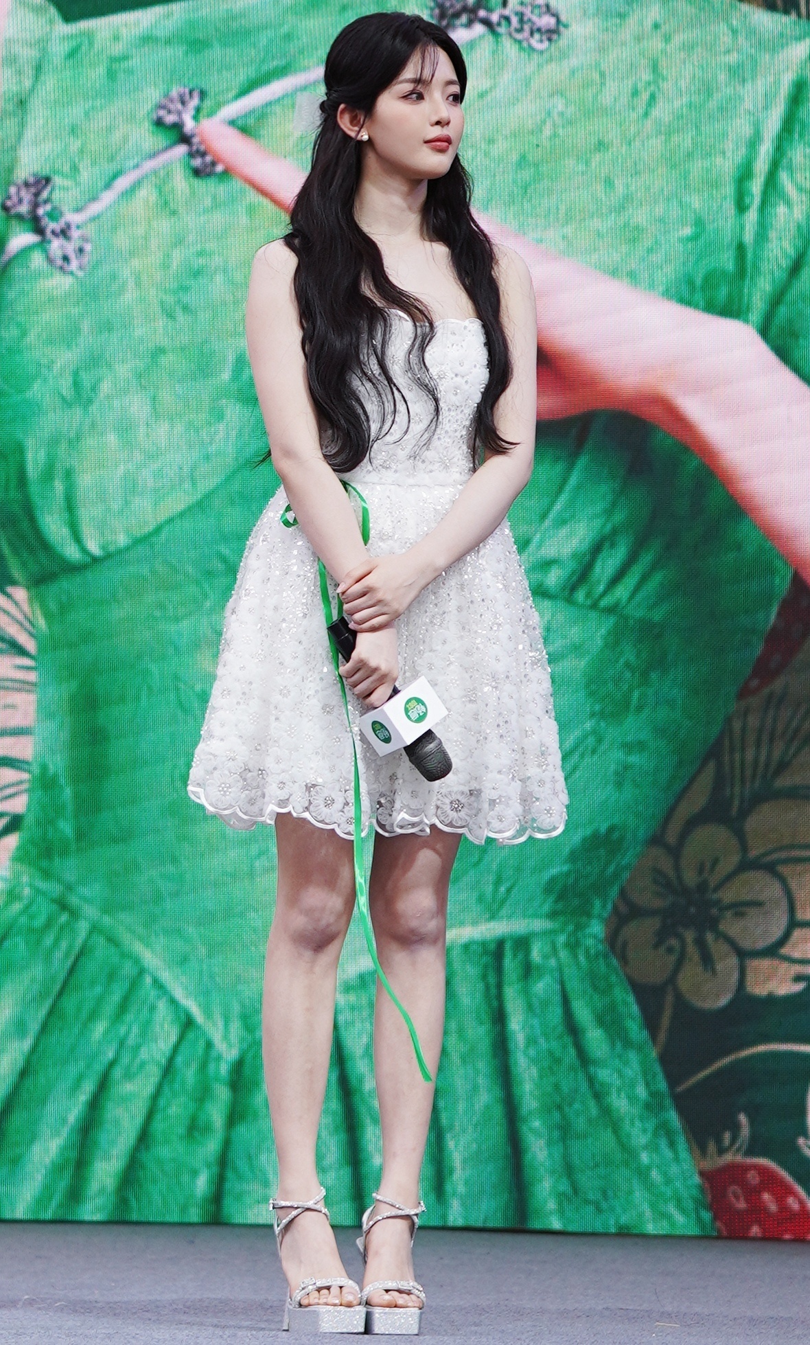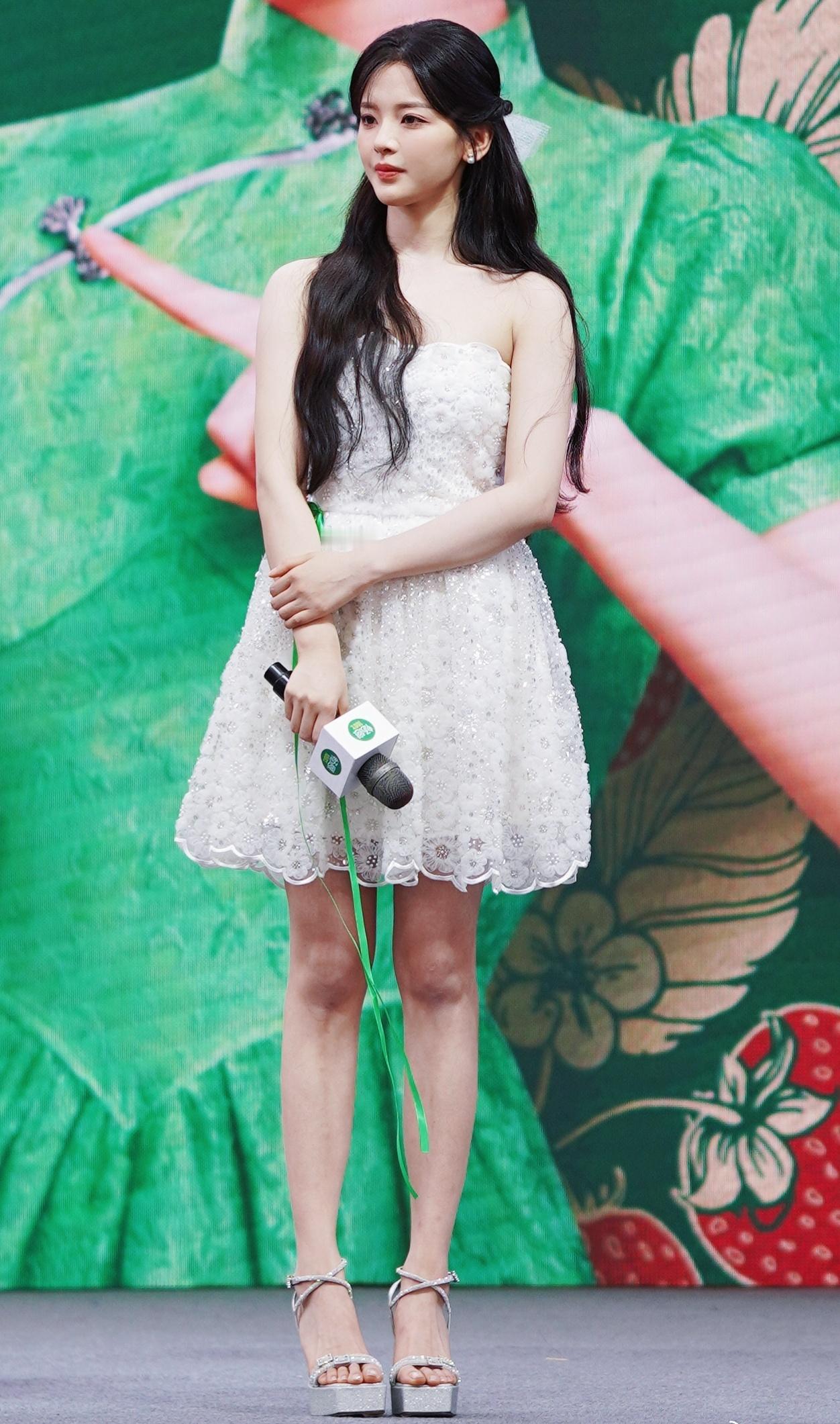 杨超越妹妹,银色一字带高跟鞋现场活动妆造