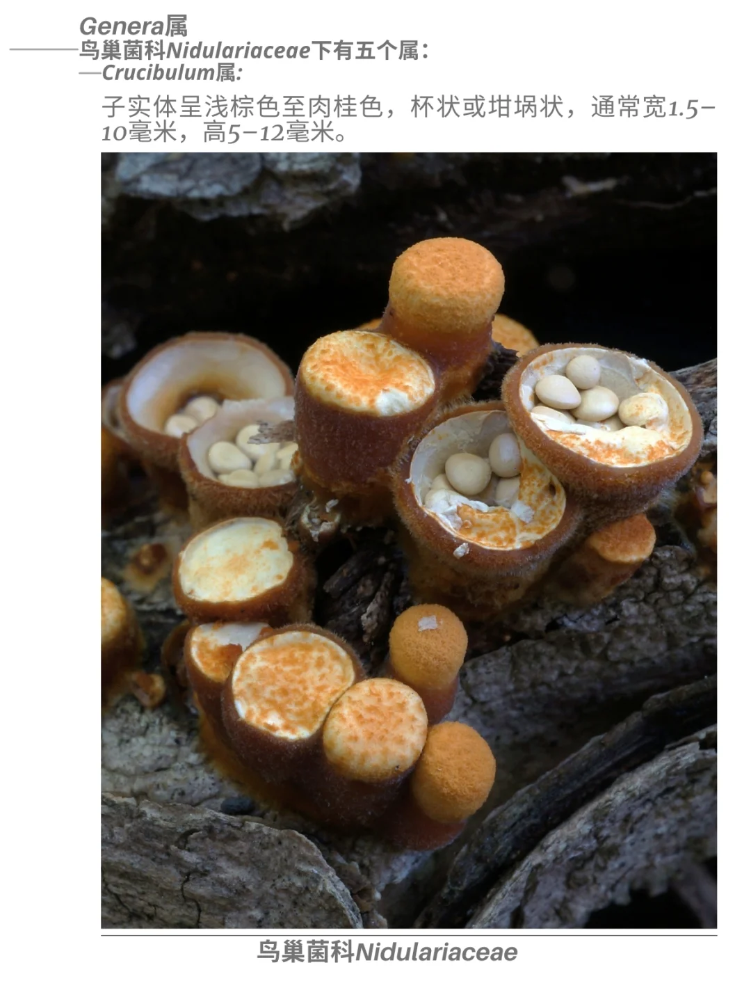 真菌 鸟巢菌 Nidulariaceae 腐生真菌 Crucibulum Cyathus Mycocalia Nidula Nidularia 鸟巢菌科Nidulariaceae(源自拉丁语“nidulus”,意为“小巢”)是伞菌目下的一科真菌。该科真菌俗称“鸟巢菌”,其子实体形似充满鸟蛋的小型鸟巢。由于其为腐生真菌,以分解中的有机物为食,常生长于腐烂的木材及富含木屑或树皮覆盖物的土壤中;其分布范围广泛,遍布大多数生态区域。该科下属五个属,即Crucibulum、Cyathus、Mycocalia、Nidula和Nidularia,通过形态学和菌盖结构的差异进行区分;近年来,系统发生分析和DNA序列比较,正引导着该科分类体系的新调整。