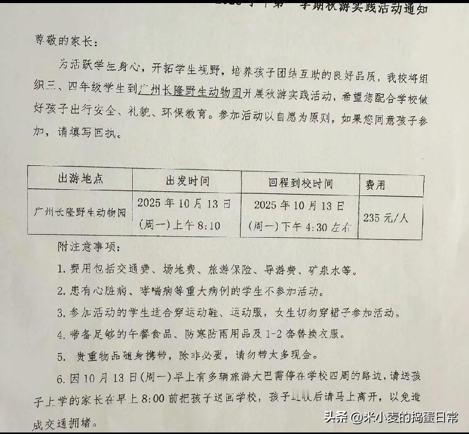 小学生秋游,秋游终于来了 小学生秋游终于不再是挖番薯了!直接杀到广州长隆野生动物园,人均235元的配置,把孩子和家长都激动坏了! 以前秋游不是下地干活就是公园散步,这次直接升级成“野生动物大冒险”,孩子们能近距离看猛兽、喂长颈鹿,这体验感绝了!家长们也直呼:这钱花得值,比在家看电视强百倍! 但也有人质疑:秋游搞这么“豪华”,是真开拓视野还是变相消费?你觉得小学生秋游该走“野趣风”还是“高端线”?