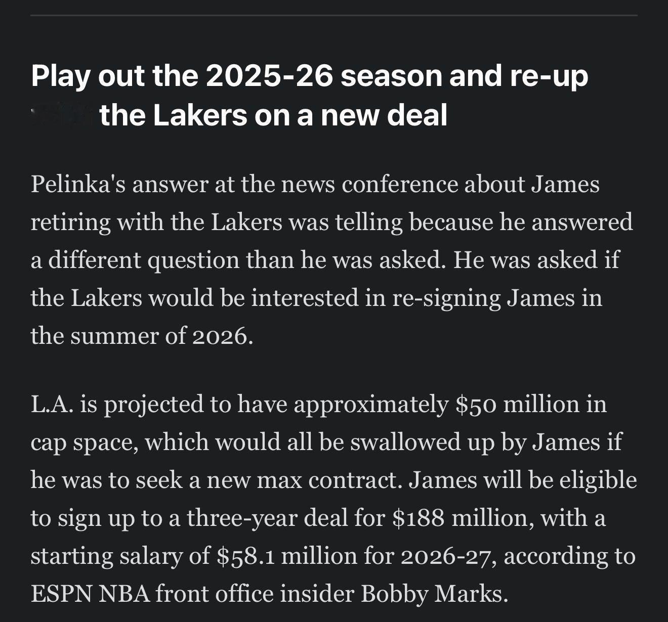 据ESPN NBA球队管理层内部消息人士Bobby Marks透露,届时湖人队预计将拥有约5000万美元的薪资空间,但若詹姆斯寻求一份新的顶薪合同,这笔空间将被他完全占据。