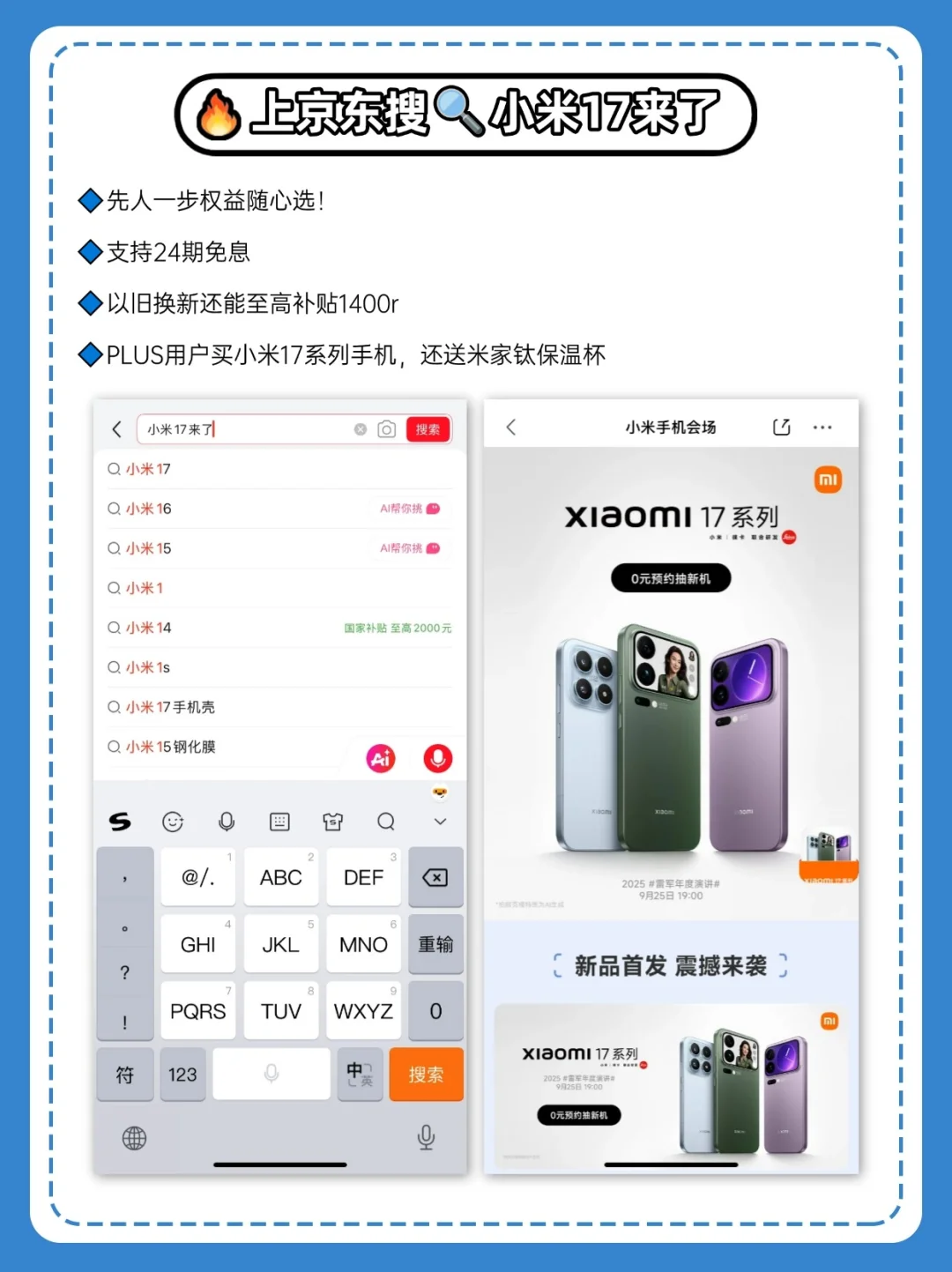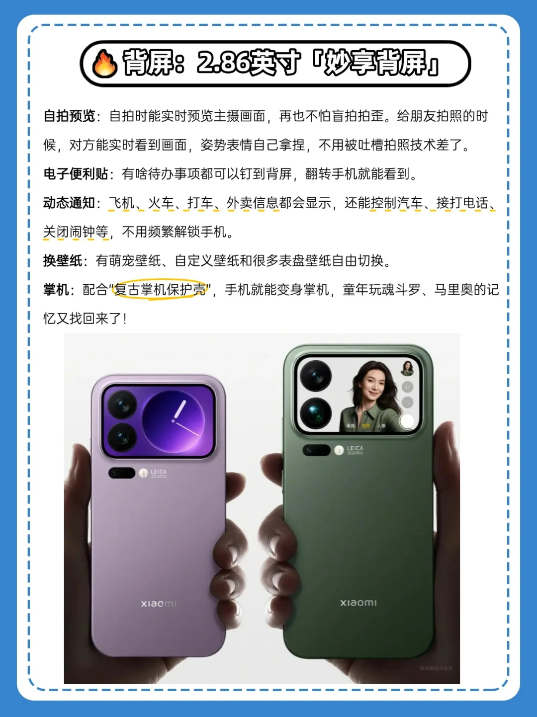 刚看完小米17系列的发布会,不得不说,从内到外提升非常大,尤其是小米17 Pro Max,这影像、这续航、这产品力,苹果真的该慌了! 🔷外观和屏幕 背部有一块2.86英寸「妙享背屏」,真的太懂女性用户了。自拍时能实时预览主摄画面,再也不怕盲拍拍歪。 这块背屏也是一个便利贴,有啥待办事项都可以钉到背屏,翻转手机就能看到。飞机、火车、打车、外卖信息都会显示,还能控制汽车、接打电话、关闭闹钟,不用频繁解锁手机。 在现在同质化的手机产品中,这个背屏设计真的让人眼前一亮。 正面是6.9英寸大屏幕,边框很窄,视觉沉浸感很高。它搭载了全新显示技术超级像素,屏幕很清晰。 背屏和正面屏幕是同材质同素质,都是小米龙晶玻璃,不用担心会摔碎。 🔷影像 后置徕卡三摄系统,其中长焦镜头是小米Pro系列大底长焦,拍半身人像,人物皮肤通透,发丝边缘虚化不生硬,连背景的光斑都圆润。 晚上逛街拍照时,人物肤色不暗沉,不丢细节,背景干净。 它是逆光抓拍的神!能同时把亮处的云霞细节、暗处的面部细节都拍清楚,不让亮处过曝成白块、暗处黑成一团。 🔷续航 内置了7500mAh大电池,妥妥的续航巨无霸,两天一充没问题。100W有线快充,手机回血速度很快,还支持50W无线快充,睡前不用找插头,早上醒来满电出门。 🔷生态 全面兼容了苹果生态,适合双持党、苹果打算转小米的用户。 比如可以在iPhone上,回复小米收到的微信消息。在Mac电脑上,可以同时打开多个小米手机App 窗口,进行多任务处理。从Mac电脑上一拖就能把文件传到小米手机里。 iPhone的照片,能一键上传小米云相册,苹果用户可以无痛换机。 优惠来啦,上京东搜【小米17来了】,先人一步权益随心选。PLUS用户买小米17系列手机还送米家钛保温杯。 支持24期免息,减轻钱包压力;以旧换新还能至高补贴1400r,打算换手机的不要观望啦。
