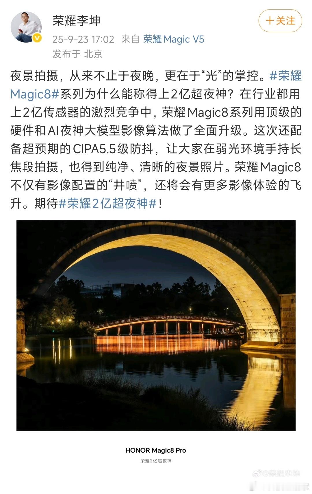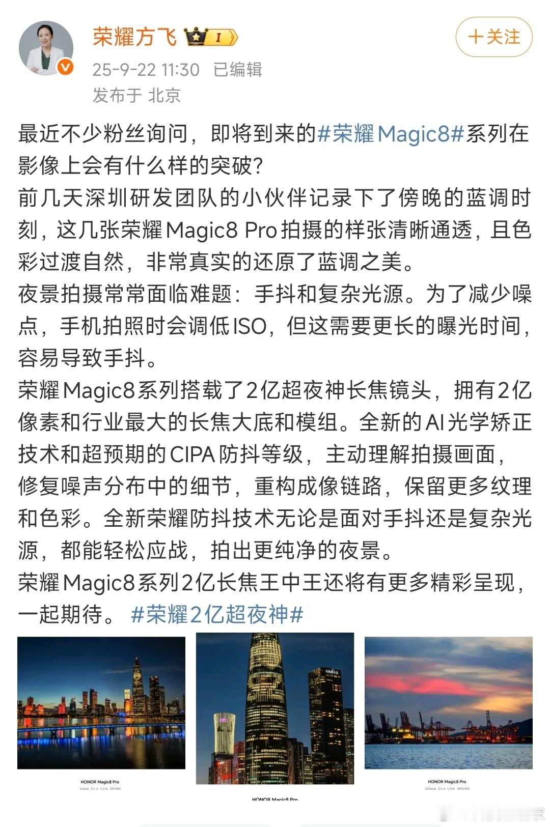 荣耀Magic8夜神强上天如何挑战最颠簸的拍摄场景?荣耀Magic8直接“上天”了!在夜晚的直升机上,挑战手机影像的新高度。结果令人惊叹,荣耀Magic8 Pro凭借行业最稳的CIPA 5.5防抖等级,仿佛在手机内部安置了“稳定系统”,大幅抵消飞行中的高频振动。画面始终如履平地,拍摄的样张不逊于专业设备拍摄的效果,同时,也将“夜空中最稳的仔”这个称号牢牢握在手中。如此极致的防抖黑科技,是否已经点燃了你的创作激情?快来说说,你最想带着它去征服哪个颠簸的拍摄场景?