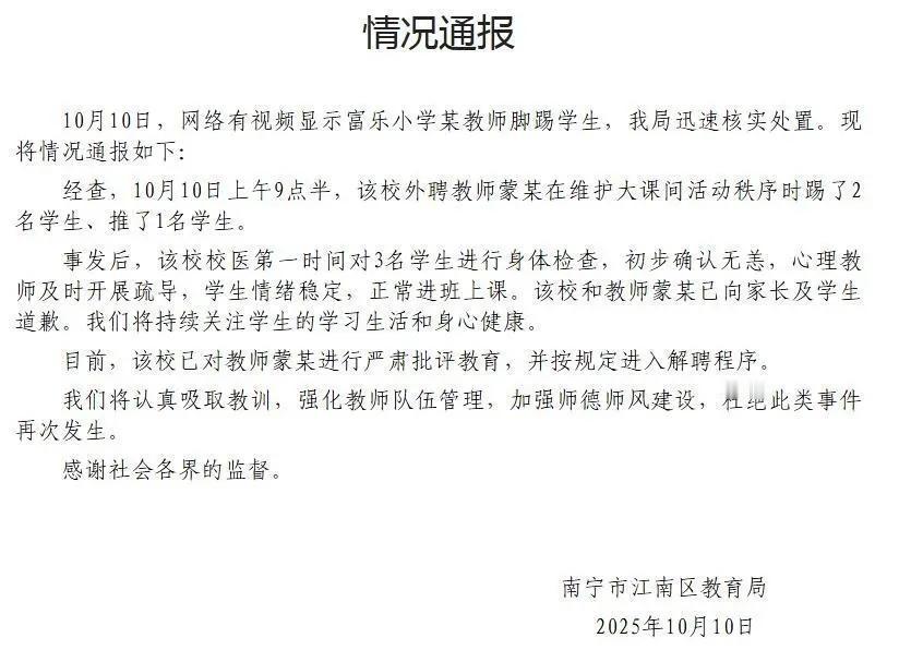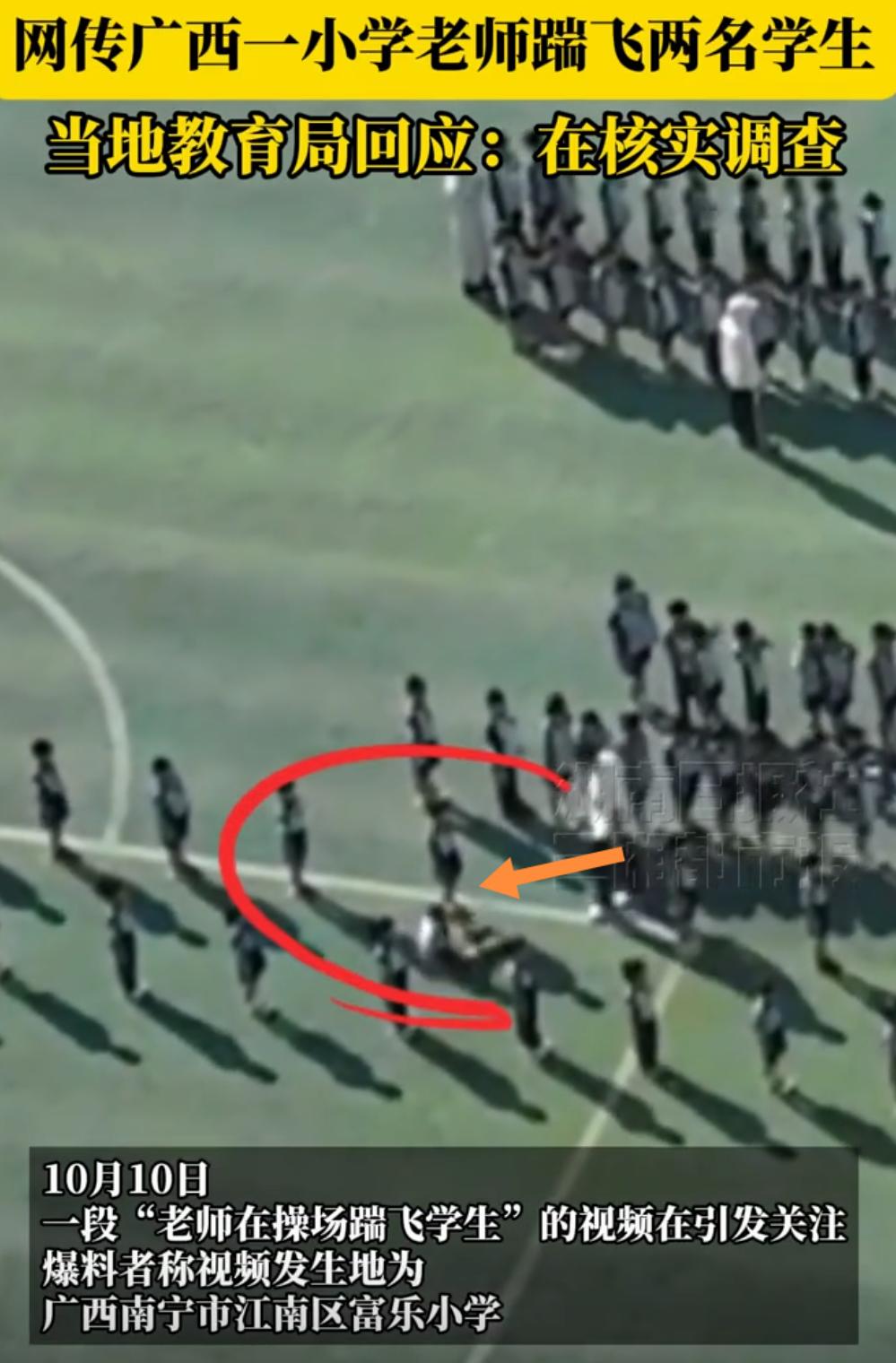 南宁教育局出通报了,确有此事! 今天广西南宁一小学校操场上,有人拍到一老师连续踹倒多个学生,网传视频画面不太清晰,好多人以认为无人机无意间拍到的。 拍摄者说,踹倒不低于10个学生,但不实,通报中说该老师为了维护大课间活动秩序,踹了2个学生,推了1个学生。 很快网友就扒出,该校是南宁市江南区富乐小学,不是无人机拍摄,是住学校隔壁小区业主在楼上拍到的。 该老师师德不行,情绪不稳定,无论学生再闹都不该动粗,70后80后上学挨打是常事,但现在时代变了,对学生如此行为就是犯法。 该事件影响恶劣,今天上午的事,调查过后不过夜就出了处理结果,三个学生检查后身体没问题,当前该老师被批评教育,接下来就是解聘。 得亏是被拍下来了,若是没被拍到,孩子不敢和家里说,心里有阴影,家长也毫不知情,对孩子健康成长影响极大。 官方通报南宁一小学老师脚踹学生 南宁学校