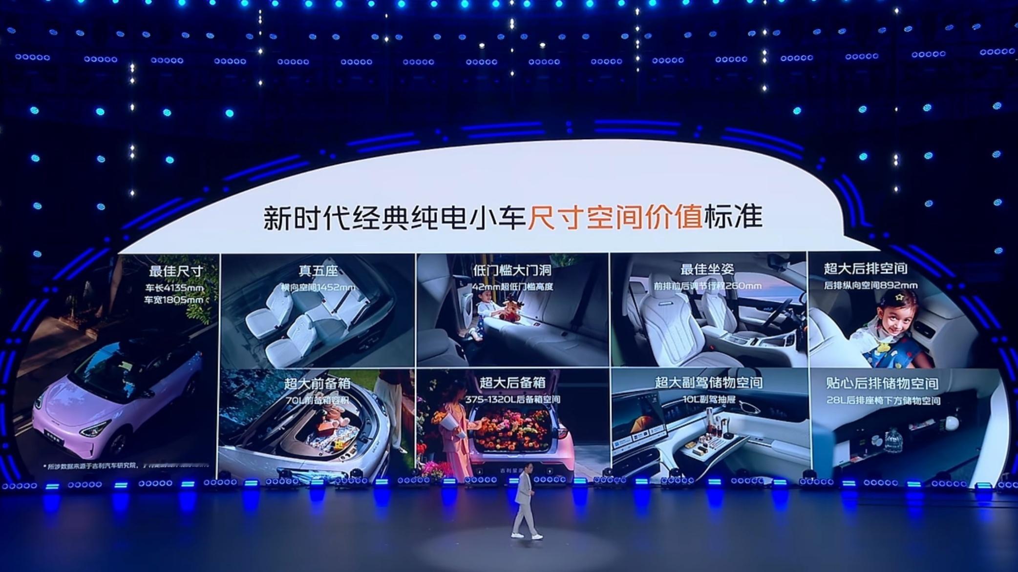 吉利星愿定位纯电小型车,基于GEA全球智能新能源架构平台打造,采用5门5座布局。空间利用率表现突出,配备70L前备箱、375-1320L后备箱,还设有10L抽屉式手套箱(310km低配版为传统手套箱)、28L后排座椅下方储物空间及5.2L扶手箱。
