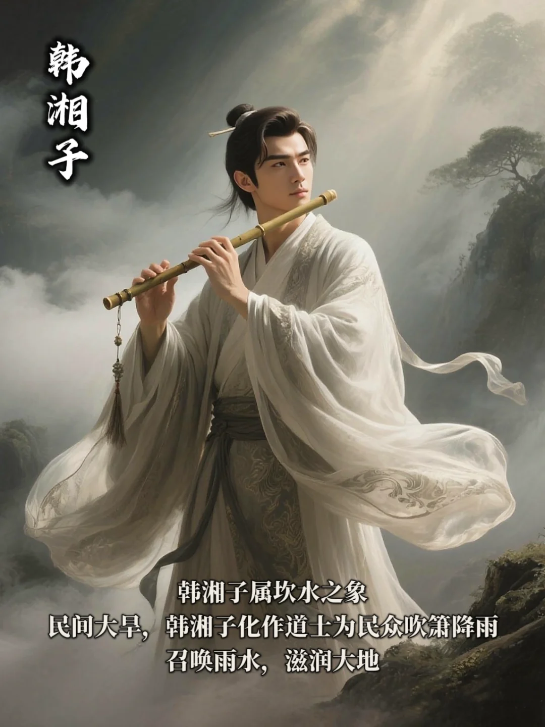 韩湘子是一位手持长笛的英俊少年,但他几世命运多舛,他的历史原型是唐代文学家韩愈的侄孙韩湘,最终得钟、吕二仙传授修行之术,隐居于终南山修道,得成正果。