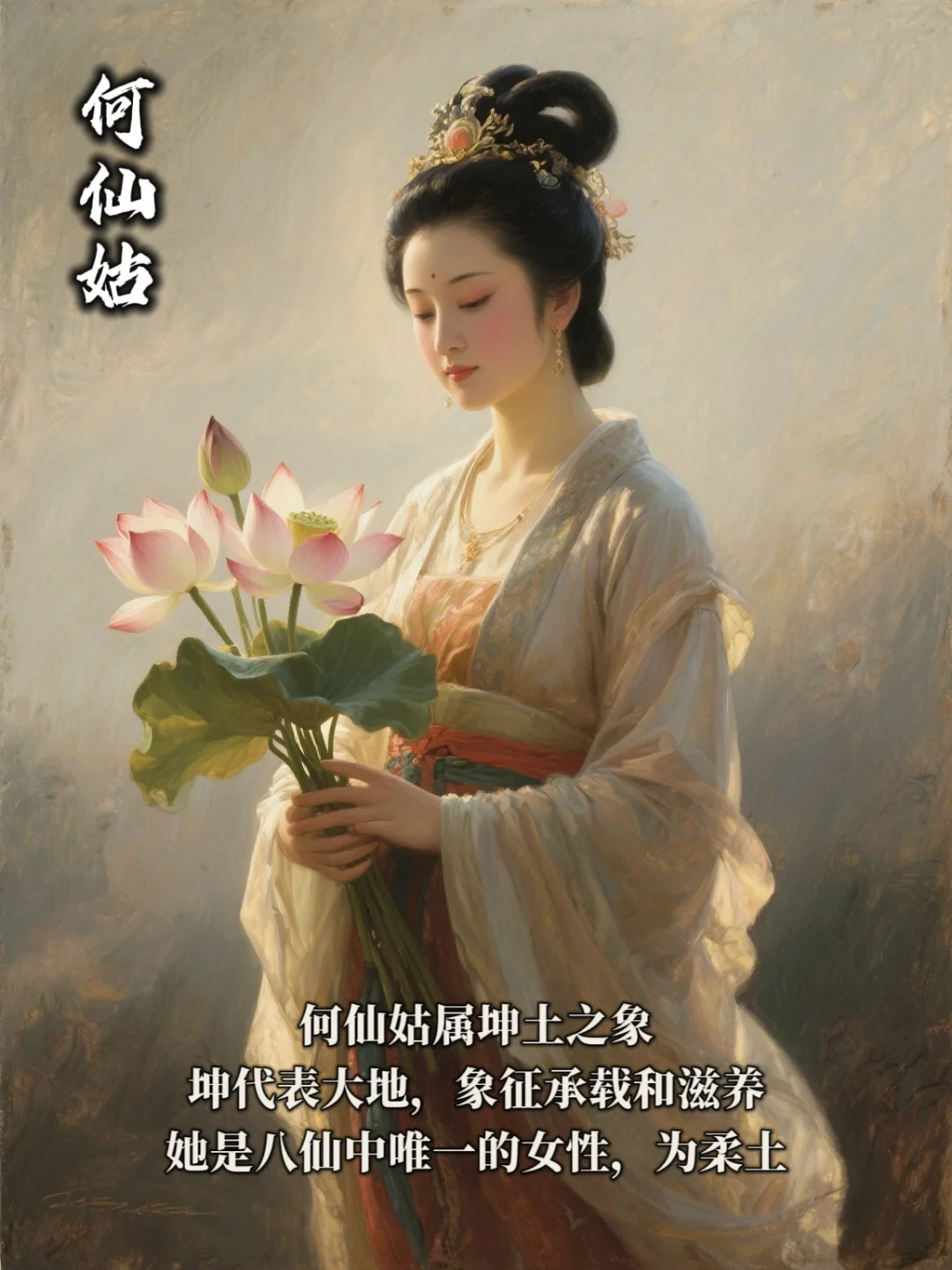3️⃣【何仙姑】八仙中唯一的女性,她手捧莲花,出尘绝艳”,是谓仙姑,曾放牧于郊野,遇道士吕洞宾送仙桃,食后不饥不渴,身轻如飞,并可预见人生祸福而成仙。