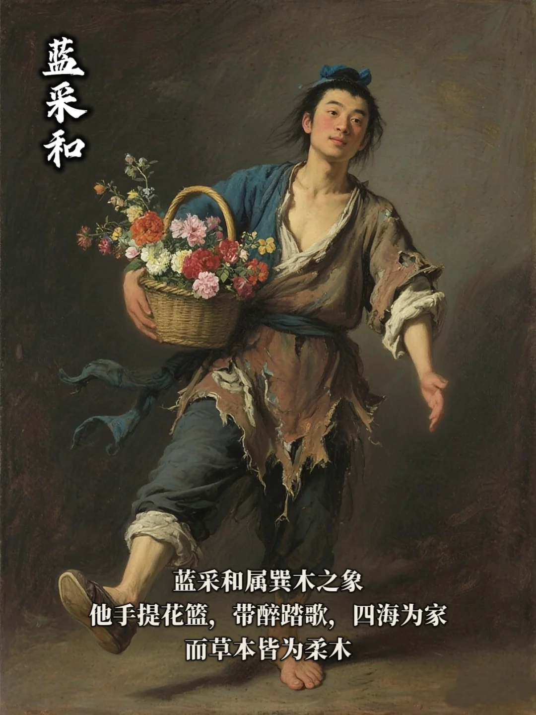 八仙中一位玩世不恭、似狂非狂的行乞道仙,原来是一名游方的道士,常穿破烂的蓝衣裳,踏歌而行,沿街行乞,最终于酒楼醉后被钟离权度化,骑鹤成仙,手提花篮。