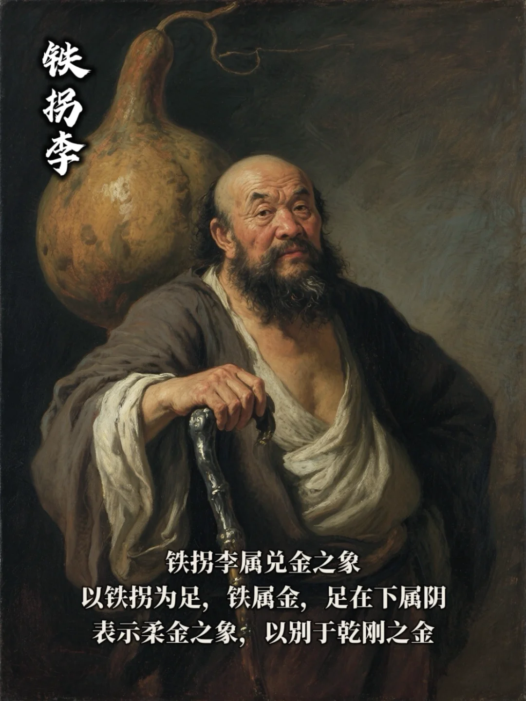 在民间传说中为八仙之首,一次元神出壳,回来后无处可托,只得投身于一个跛乞丐,老君授他金箍一道收束乱发,一根铁拐助拄跛足,他常背一葫芦,据说里面装有悬壶济世的仙药。
