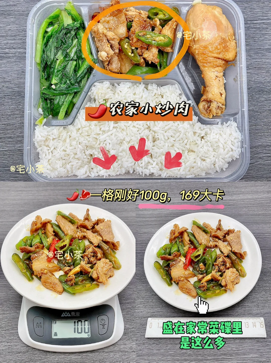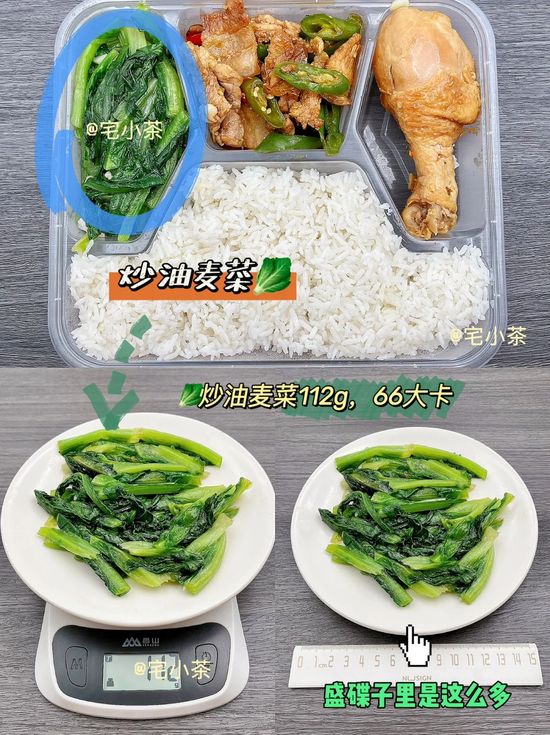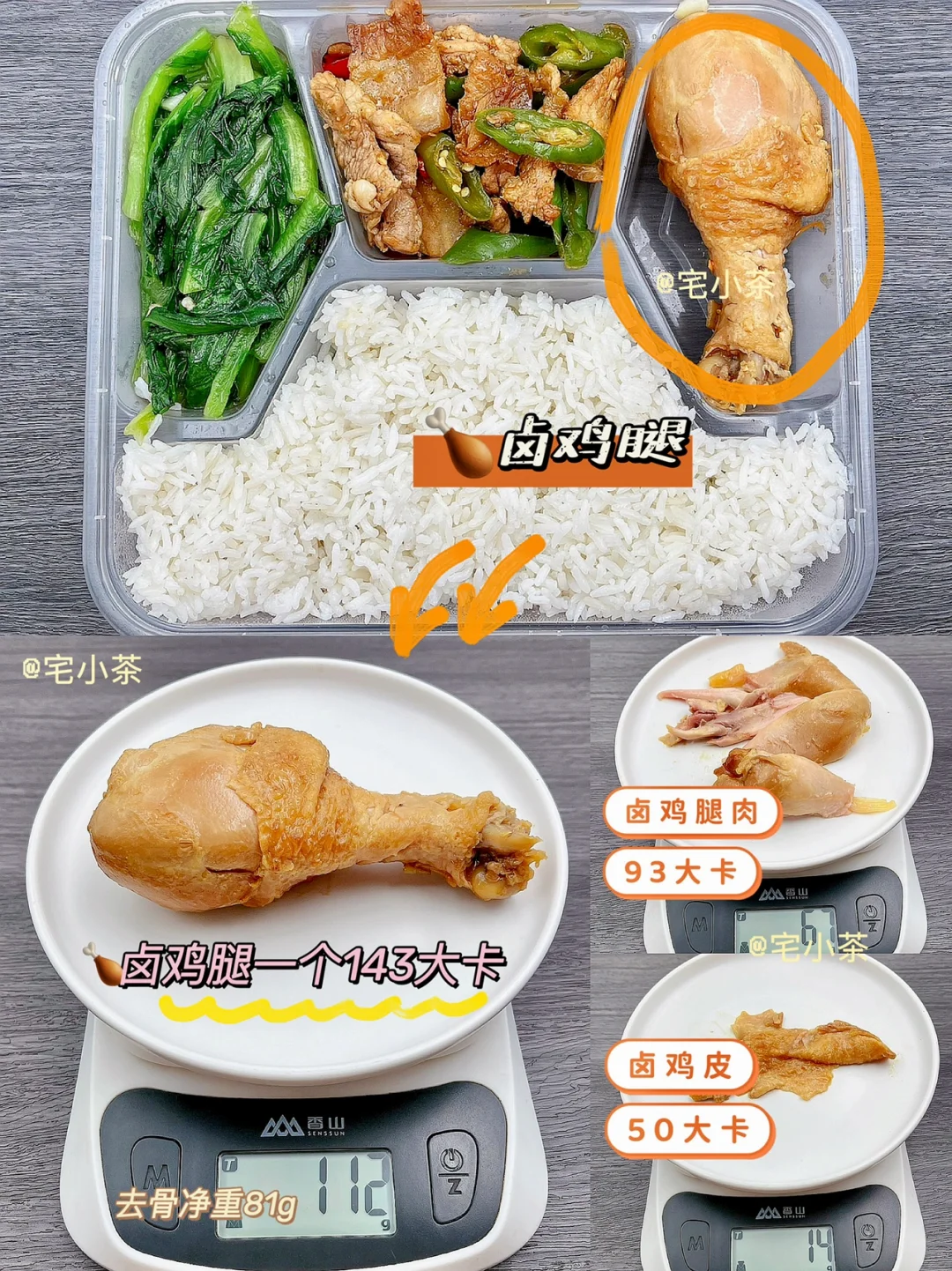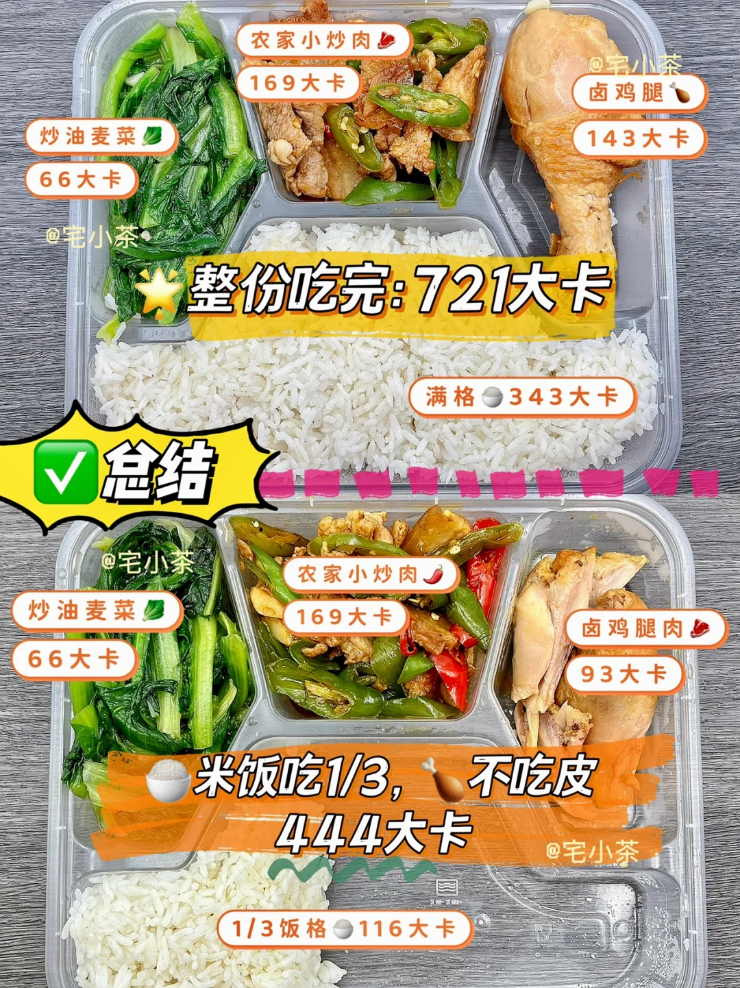 哈喽集美们!本期是大家点名的外卖餐盒热量测评~同样是超详细拆分! · ✅总结放前面: 🔸整份吃完:721大卡 🔹米饭吃1/3~1/2,不吃卤鸡皮:444大卡~502大卡 · ✅详细拆分如下: (本期测评均为净重,重量和热量码在图片上啦,可以直接查看~) 一满格:296g,343大卡 1/3饭格:100g,116大卡 炒油麦菜:112g,66大卡 农家小炒肉:100g,169大卡 卤鸡腿:81g,143大卡 包括, --卤鸡腿肉:67g,93大卡 --卤鸡皮:14g,50大卡