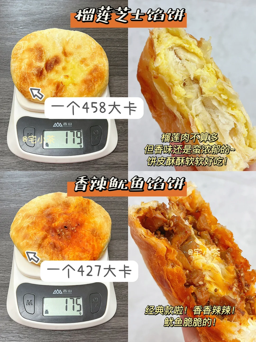 哈喽大家好呀~本期是姐妹们点名的麦多馅饼热量测评! 总的来说,一个馅饼热量在400~500大卡左右,早餐吃一个木有问题,不用太有鸭梨![扯脸H] · ✅本期测评包括: *重量&热量已标注在图片上,可直接查看! ➡️榴莲芝士馅饼 榴莲肉不算多,但香味还是蛮浓郁的~ ➡️香辣鱿鱼馅饼 经典款啦!香香辣辣!鱿鱼脆脆的! ➡️黑椒牛肉馅饼 牛肉爆汁细腻!黑椒味清新! ➡️照烧鸡腿馅饼 鸡腿肉很大块很饱满~饱足感强!