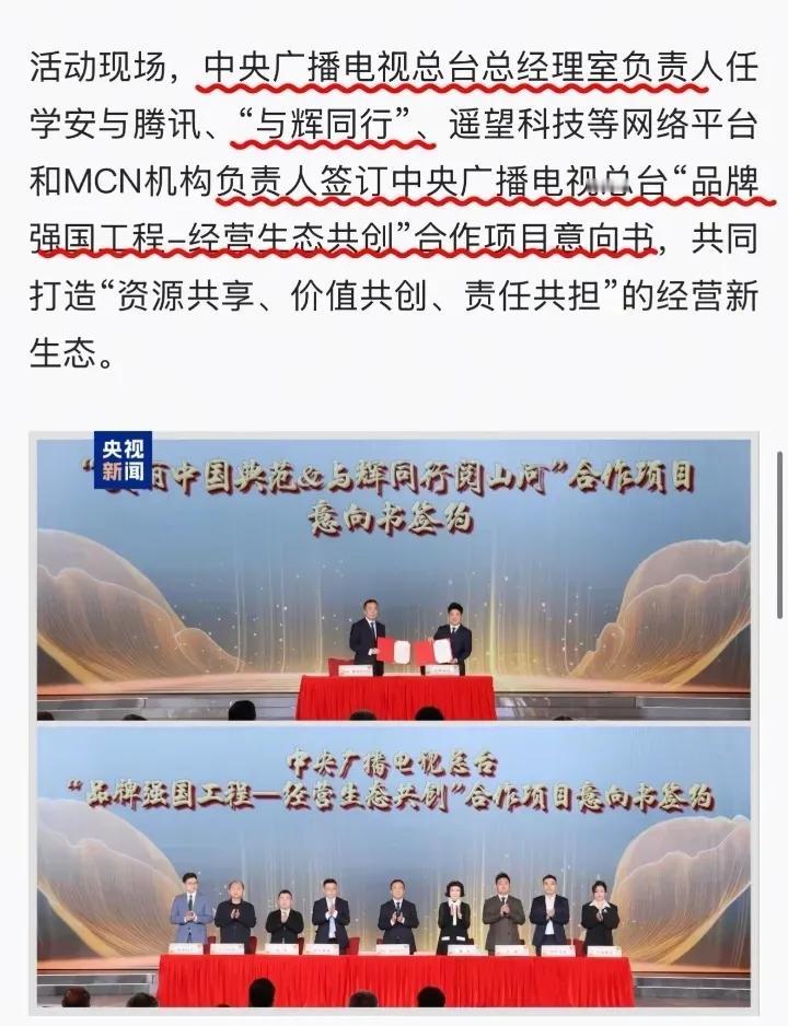 怪不得今晚宇辉西装革履的出来直播了, 原来今天和央视签署了品牌强国经营生态工程合作项目意向书, 这可不是小打小闹,这是对宇辉和与辉同行阅山河栏目的超大肯定啊! 想想一路走来,多少谩骂否定声,但宇辉愣是扛下来了。现在与辉同行做得风生水起,新开的兰知春序直播间也圈粉无数。与辉同行早就不是单纯卖货的直播间了,它装着大家的期待和信任,更是直播同行的标杆。 往后肯定更忙,但咱就信宇辉和他的小伙伴能守住初心。你们觉得这波合作会给直播界带来啥新变化?来评论区聊聊你的想法~