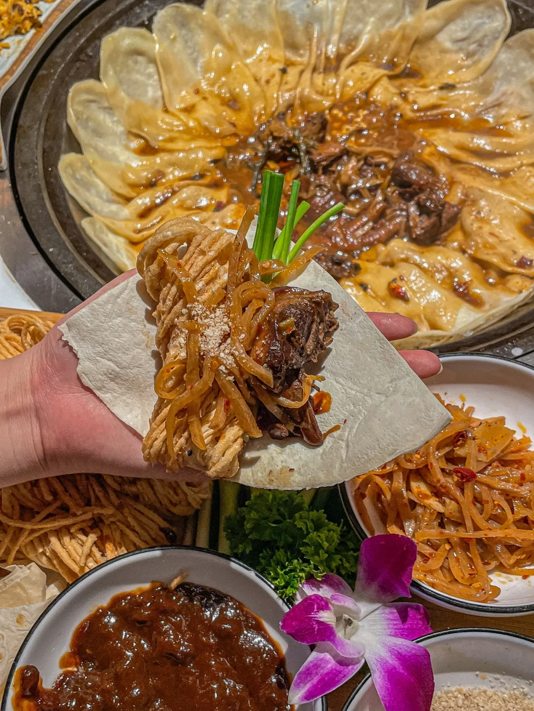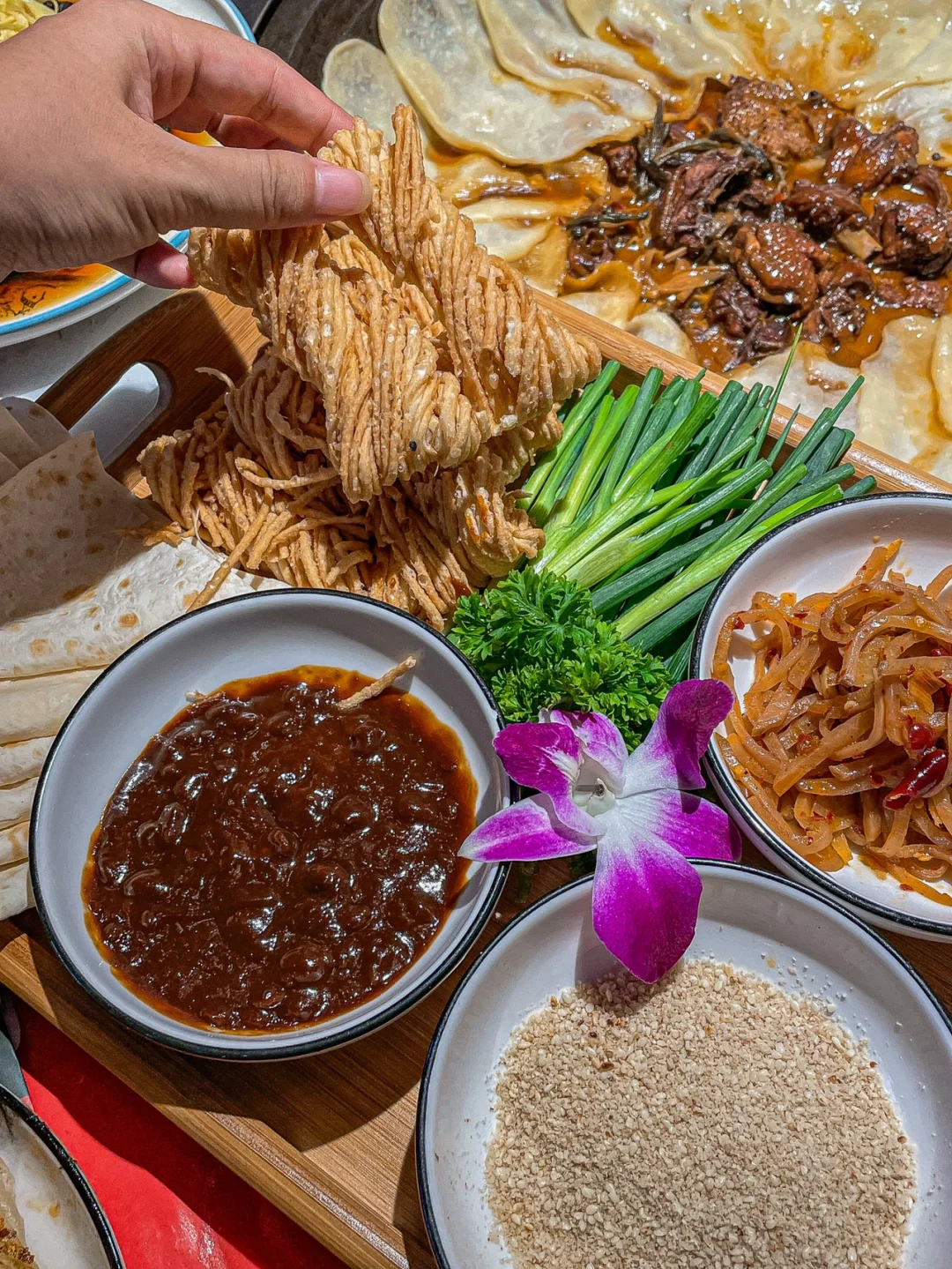 第一次吃烙馍卷馓子 ,碳水炸弹!大葱蘸着大酱,还有咸菜和芝麻,烙馍有韧性,一口咬下去酥脆咸香~