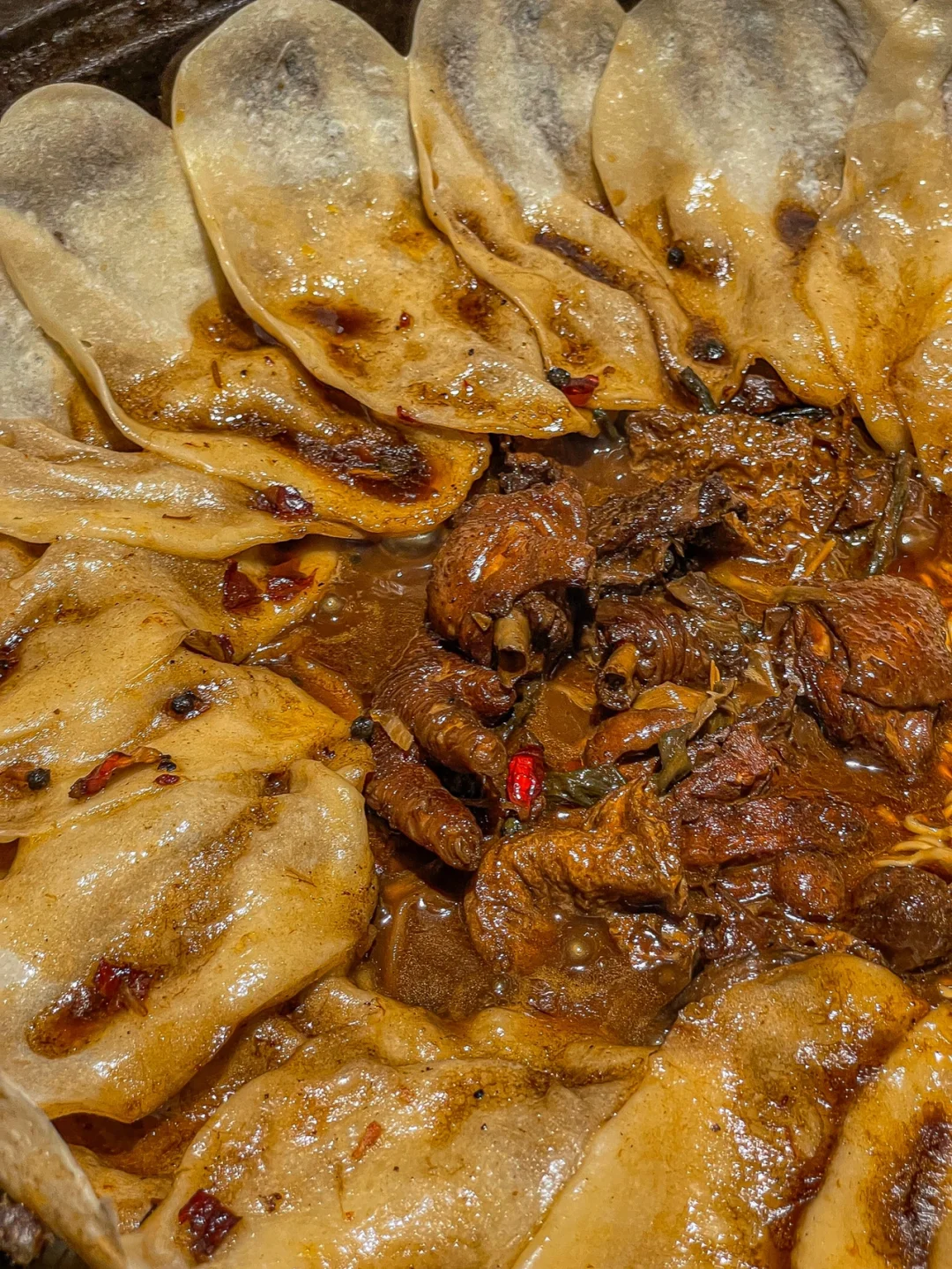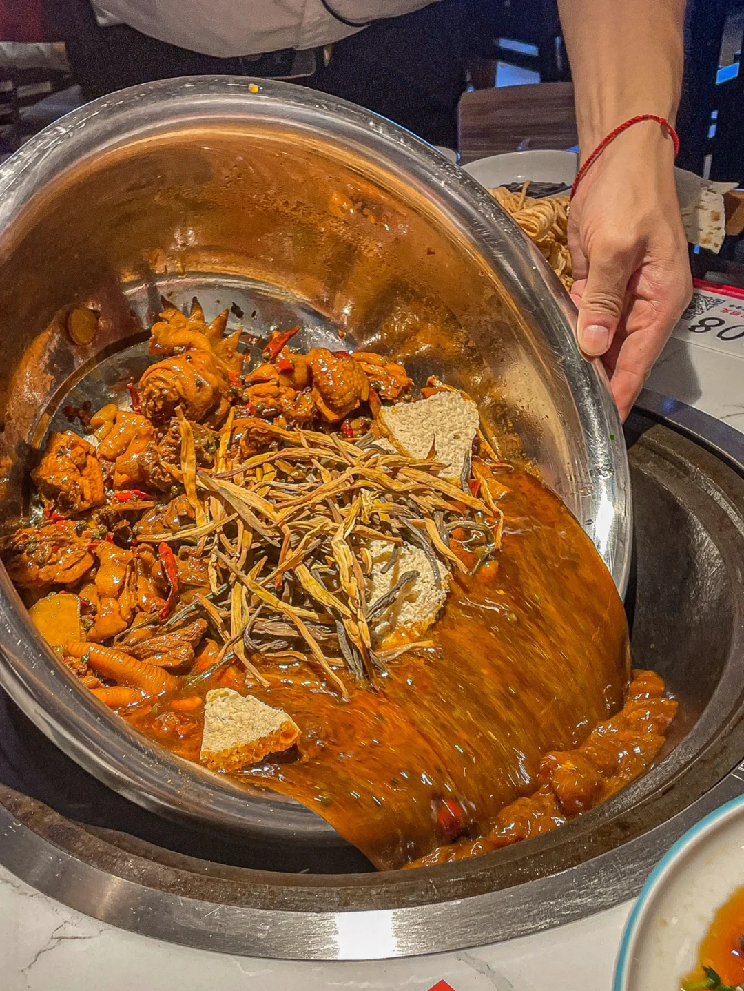 这一锅份量真的是太足了,可以选择辣度🌶️,用的是大公鸡,肉质香糯紧实👍,煮的非常入味!里面还有干豆角、黄花菜、脆豆腐