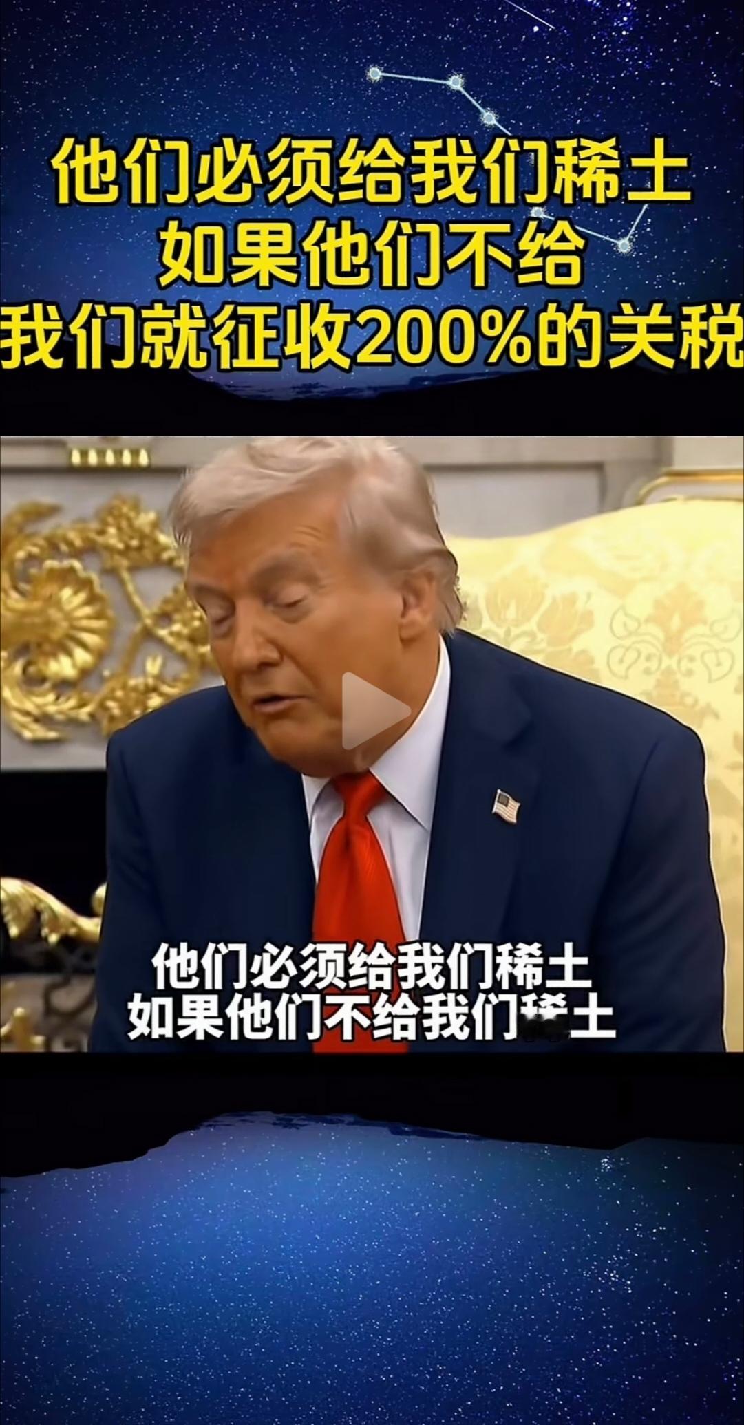 美国总统特朗普公开对媒体说,中国必须给美国出口稀土,如果限制了,那么美国将对中国