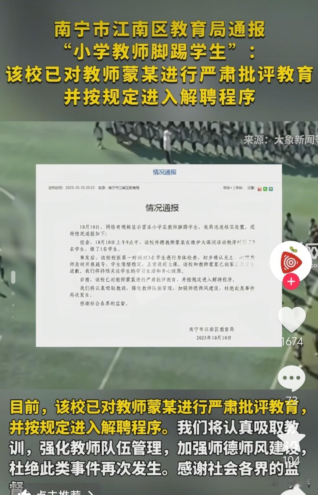 10月10日,广西南宁的一小学操场上,小学生被老师踹飞的视频引发热议! 在一个操场上有老师用脚踢倒学生,视频中可以看见,有两名学生被依次踢倒后,又迅速起身回到了原来的位置上, 接着,他又用手指着另一个人的头,神情间满是怒意,像极了人们怒到极致时的样子如出一辙。 这个老师踹的力度可不小,把小孩踹倒在地,而看他脚的位置,好像在肚子和胸口上面。 在操场上,同学们都是在排队,有可能是这几个同学在排队这方面没有做好,但是每次开家长会,老师都说要学会跟孩子多沟通,听孩子们心里的想法,动手是解决不了问题的。 视频上传到网络之后,评论区也是炸了锅。有网友说,我们小时候都是这么过来的,小时候老师扇我大嘴巴子,脑袋还磕墙上了。网友说,教育方式不同,棍棒底下出好学生,我们当年都是这么过来的。有一个网友说,小时候被老师打的肋骨都断了一根,老师还威胁我说不要告诉家长。 我记得小时候在学校不守规矩,都会被老师打,都像家常便饭一样。有的人认为口头教育就可以了,但是这个一脚把他踢飞有点过分,应该要以批评为主。 据南宁市江南区教育局的通报,已对教师蒙某进行了严肃批评教育,并按规定进入解聘程序。 目前,学校和蒙某也已经向学生和家长道歉了。