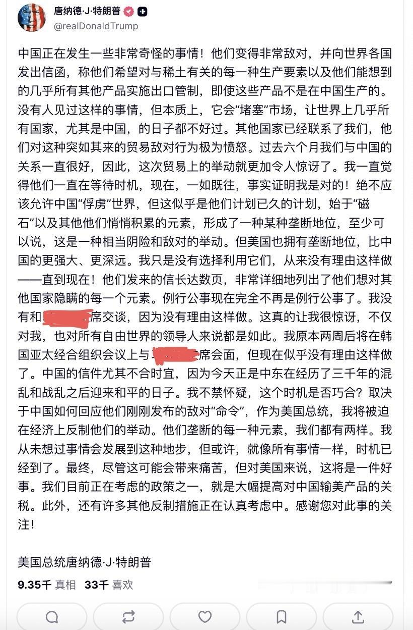 中方一连串的反制,把特朗普搞得惊慌失措、气急败坏了!中美经济脱钩要来临? 因为特朗普的牌打完了,发现还是没有拿捏住中方。他发了两个帖子抱怨中方,措辞也非常严厉。这证明中方打到了美国人的七寸,让美方很难受。因为他拿不到更多的稀土资源,这会彻底影响到美方军工体系生产军事装备的进度。 对于中方采取的稀土新反制措施,特朗普在这两个帖子里连续用了:“前所未闻”“没有人见过这样的事情”,说明美方也是始料未及,至少不在特朗普的意料之中,他没想到中方的反制力度会如此之大。 特朗普甚至在第二个帖子中抹黑中方的反制是“阴险而敌对的举动”,声称绝不允许中方“俘虏全世界”。 不过,令人更为关注的是,特朗普应对中方的反应,特朗普在第一个帖子中已发出自11月1日起要对中方额外实施100%的关税的公告。他还在第二个帖子中宣称,美方还在研究其他反制措施。 这似乎又回到了特朗普开打关税战的起始状态。这也从侧面证明,面对中方的反制,特朗普已经没有更好的应对措施,又回到他熟悉的利用关税来征服中方的老办法了。 在美方此前逐步升级的芯片出口限制下,中方国产芯片也在不断取得新突破,中方甚至要求国内需求方停止购买英伟达专供中方的芯片。在中方实施稀土新管制的同时,甚至下令对高通进行反垄断调查。这足以证明中方在国产芯片领域实现自给自足的底气。 此外,在美国大豆丰收季,中方每年100多亿美元的大豆进口,今年却连一粒大豆都没有进口,这让美国豆农损失惨重。这都是中方一连串反制措施。 在这种形势下,特朗普的确没有更好的牌可以打。然而特朗普打关税战,中国会再次反制,这绝对是双输的结果,就看谁先承受不了。 但特朗普这次是一对一与中国斗,上次是特朗普跟全世界斗,这大概就是特朗普威胁要再对中方加增额外关税的底气吧。 美国人想要让中国低头、认输,但中方想要让美方认识到我们不是好欺负的,别拿过去的姿态来俯视我们,美国要尊重、正视并接受中国崛起。这就是中美今天的斗争现状。 中方的牌还有很多,美方如果与中方全面脱钩,中方实际上已经做好了准备。要知道自关税战开打以来,中国的出口贸易显示是递增的(增长近3%),中国持续加大与拉美、非洲、东盟、欧盟等地区的贸易合作。 因为中国是全世界最大的制造业生产中心,制造业增加值占比30%,比美国、欧盟、日本、韩国等加在一起还要多。这就是中国的底气。 中国可以离开美国,但美国绝对离不开中国。但说实话,中美经济战总好过于军事战争。 特朗普怒怼 涉稀土出口管制 中方接连出手 稀土技术管制背后的深层博弈 中美贸易摩擦