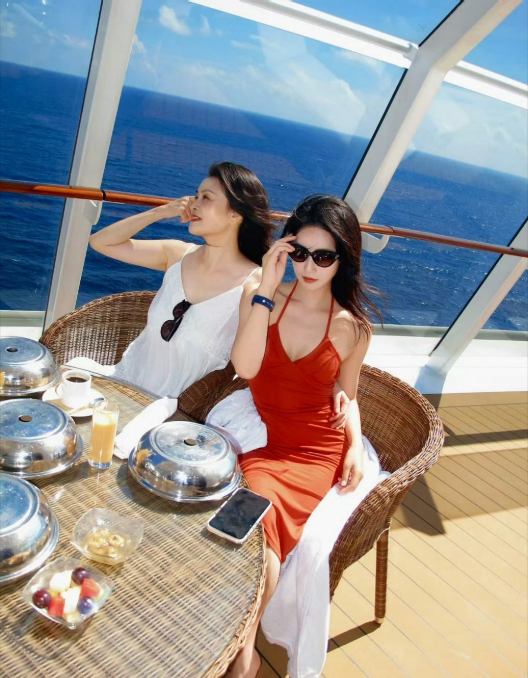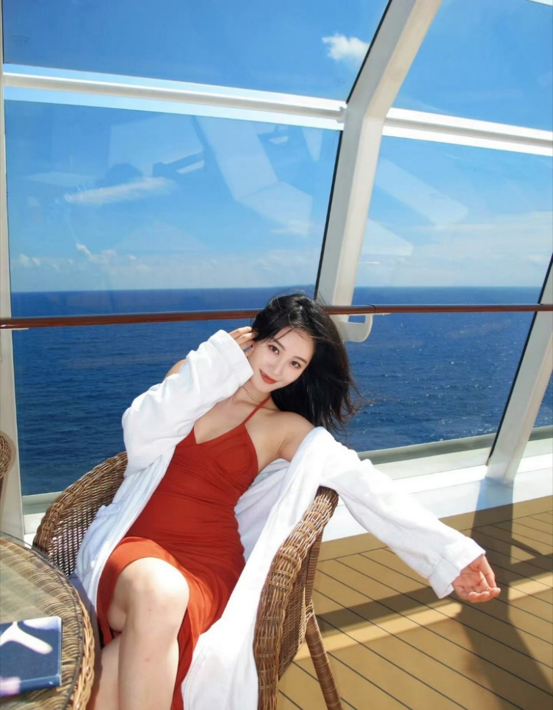 红色衬得蓝盈莹肤色好美,海边就是舒服~