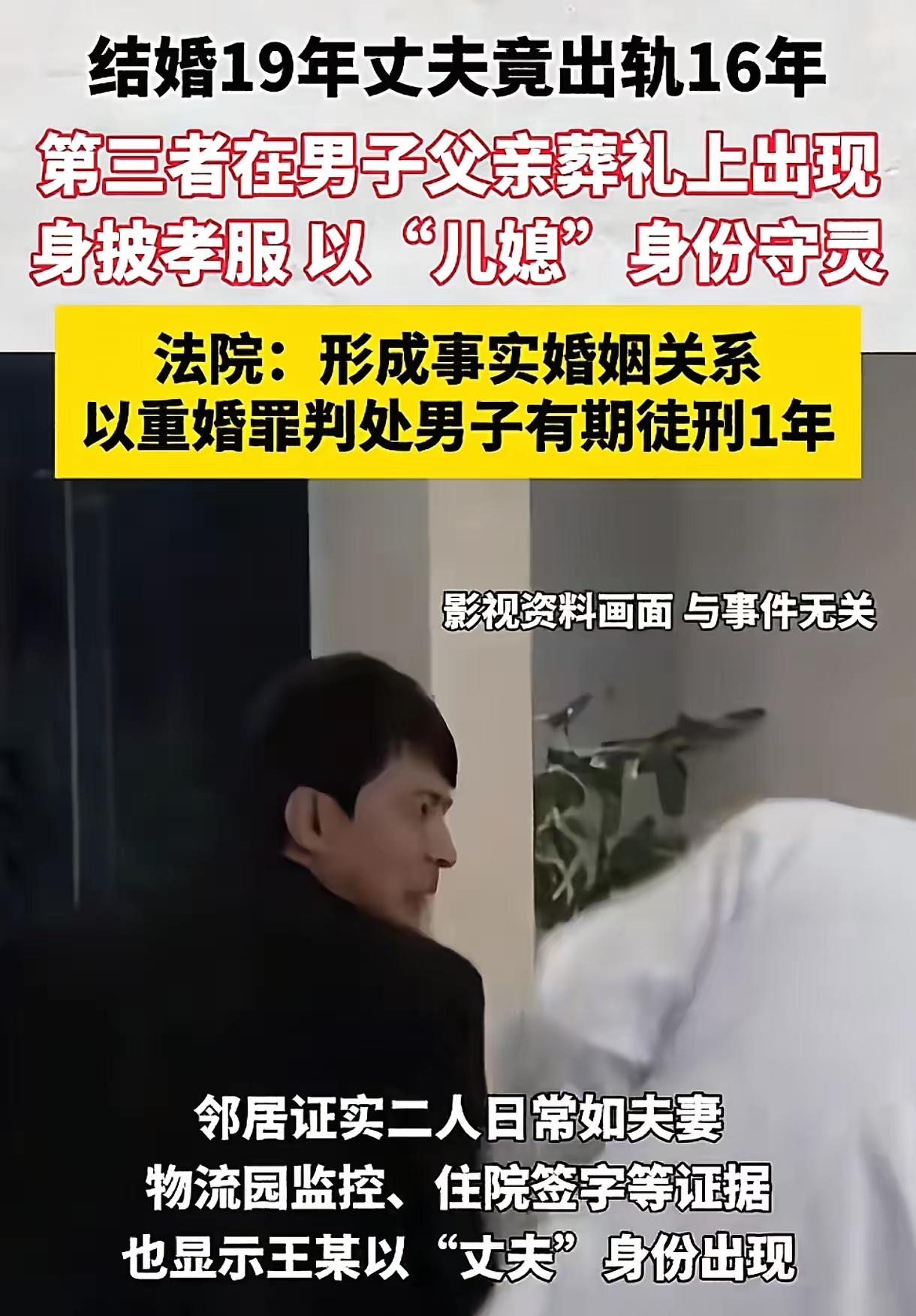 山东临沂,女子的公公去世,她在操办公公的丧事时,发现有个陌生女子披麻戴孝,以儿媳的身份守灵。一打听才知道,结婚19年的丈夫已出轨16年,外面还有个私生子,而他却撒谎说在外跑长途货运,女子一气之下把丈夫告了,法院判决,出乎意料。 山东临沂的张大姐怎么也想不到,自己尽心尽力操办公公丧事的那天,会撞破藏了 16 年的惊天秘密 ,灵堂里突然多了个陌生女人,穿着和她一样的孝服,规规矩矩地跪在蒲团上守灵,一问才知道,这女人竟也是丈夫口中的 “媳妇”。 张大姐和丈夫结婚 19 年,这些年里,她在家照顾老人、操持家务,丈夫则一直说自己在外地跑长途货运,偶尔才能回家一趟。 虽然聚少离多,但张大姐从没想过怀疑,每次丈夫回来带些外地特产,说几句路上的辛苦,她都心疼得赶紧做些热饭热菜。就连公公生病住院,也是她忙前忙后陪护,丈夫只在最后几天赶回来,还说因为货运旺季耽误了时间。 公公去世后,张大姐忙得脚不沾地,联系亲戚、准备丧礼用品、布置灵堂,每天只睡三四个小时。丧礼当天一早,她刚给公公的遗像上香,就看见一个穿着孝服的女人走进来,径直走到灵前跪下,动作熟练得像是早就排练过。 张大姐纳闷,上前询问对方是谁,女人抬起头,语气平静地说自己是 “孩子他爸的媳妇”,这话让张大姐瞬间懵了,以为是对方认错了人。 直到旁边丈夫的妹妹小声提醒,张大姐才知道,这个女人已经跟着丈夫 16 年,两人还有个 10 岁的儿子,全家上下早就知道这件事,就瞒着她一个人。丈夫这些年所谓的 “跑长途”,其实是在外地和这个女人过日子,偶尔回家也只是应付她。 张大姐想起自己这些年的付出,想起每次打电话丈夫都说在开车、匆匆挂断,想起自己为了这个家省吃俭用,眼泪一下子就涌了出来,当场气得浑身发抖。 等丧礼忙完,张大姐没跟丈夫吵也没跟丈夫闹,直接收集了丈夫和那个女人同居的证据,还有亲戚无意间透露的证词,把丈夫告上了法院,要求追究他重婚的责任。 可丈夫却满不在乎,说自己只是和对方 “搭个伙过日子”,又没领结婚证,根本不算重婚,还说张大姐小题大做,不顾多年夫妻情分。 张大姐原本以为这场官司会很漫长,没想到法院很快就给出了判决,虽然丈夫没和那个女人领证,但两人以夫妻名义共同生活 16 年,还育有子女,周围邻居也都认为他们是夫妻,已经构成事实婚姻,丈夫的行为属于重婚,需要承担相应的法律责任。 拿到判决书的那一刻,张大姐积压多日的委屈终于有了说法,也彻底放下了这段 19 年的婚姻。 对此,你们怎么看?欢迎留言评论~