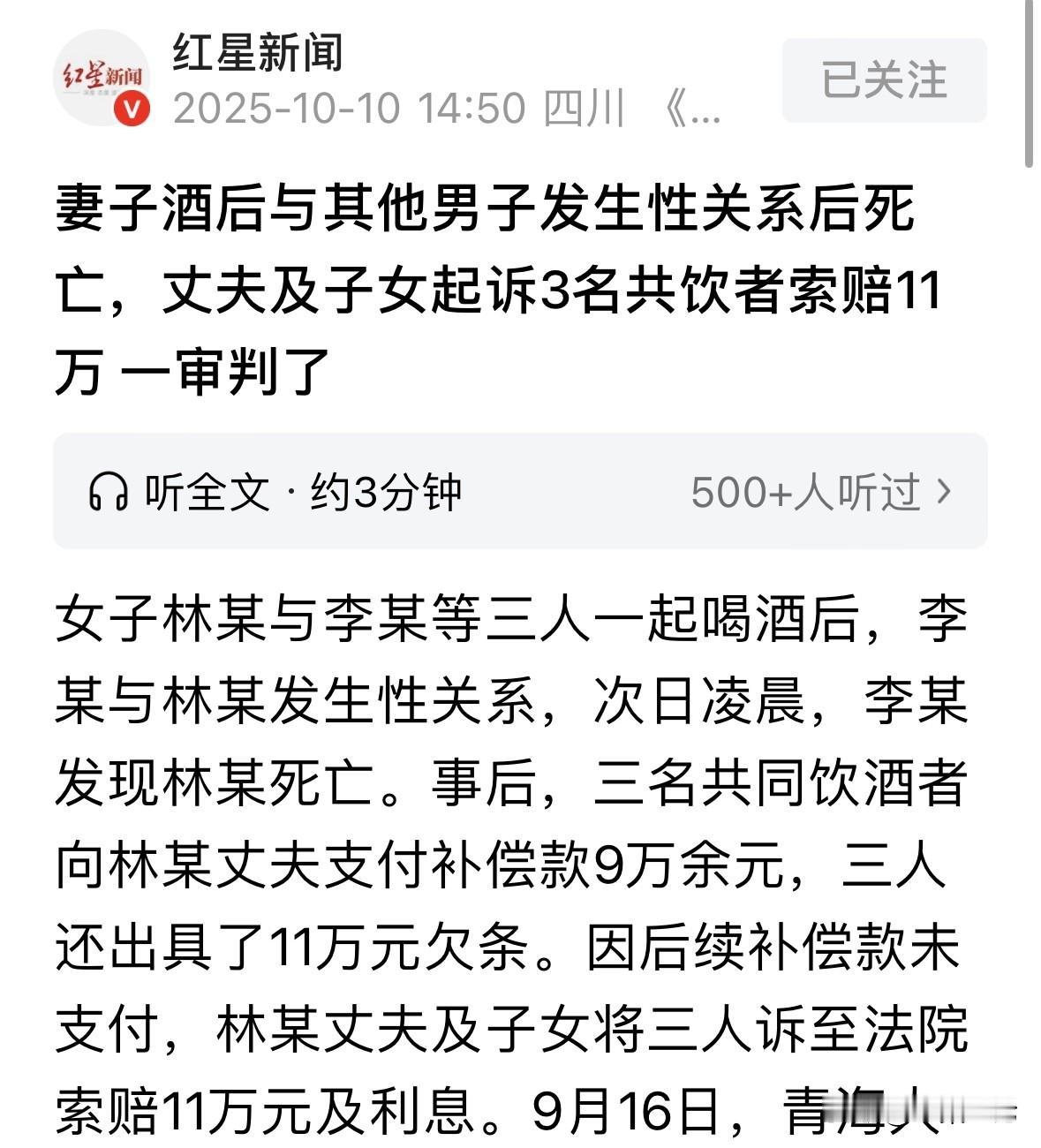 青海西宁,女子和3个朋友聚餐喝完酒后,带着其中俩朋友回了出租屋继续喝,其中一男性朋友酒后和她发生了关系,哪成想,夜里女子竟脑出血死亡了,男子凌晨发现后,连忙通知女子丈夫,事后,连带男子的3名同饮酒者向女子丈夫支付了9万的赔偿款,并开了11万的欠条,因为欠款迟迟没支付,女子丈夫就把3人告上法院,索赔那11万的欠款和利息,然而,法院判决却出乎了女子丈夫的意料。 李某和林某早年在工厂打工时相识,后来林某又通过别人介绍认识了祁某和张某。 2023年12月22号那天,为了撮合祁某和张某,4个人约在一家小饭馆吃饭。 饭桌上气氛不错,几个人喝了两斤多白酒,等吃完饭已经挺晚了,张某自己打车回了家。 剩下的祁某、李某和林某仨人则勾肩搭背一起去了林某的出租屋。 到了屋里,李某和祁某又开了白酒接着喝,林某没再喝。 晚上11点左右,祁某先走了,只剩李某和林某在屋里,接着,李某和醉酒的林某发生了关系。 之后李某起来喝了点水,就在客厅沙发上睡着了。 第二天早上6点多,李某醒来发现林某躺在身边没动静,他一摸才发现,林某身体都凉了。 他赶紧哆嗦着手用林某的手机联系了林某的丈夫赵某,赵某赶来后报了警。 法医那边出具的报告显示,林某本就患有脑血管病,那晚喝了不少白酒,再加上后面的性行为,这才诱发了致命脑出血。 配合做完笔录后,警方就让李某他们和林某家人商量赔偿的事。 面对赵某,几人也没推脱责任。李某当场签了5万欠条,又掏了5万块。祁某打了3万欠条先还2万,连早早回家的张某都含着泪塞给赵某2.05万元,承诺再补3万。 几人就这样又开了11万的欠条,可后来赵某一直没收到这笔钱,于是他和子女一起,把李某、祁某和张某告上法庭,索赔11万元和利息。 那么,从法律角度,怎么看待这场官司? 《民法典》第1165条规定:行为人因过错侵害他人民事权益造成损害的,应当承担侵权责任。 李某和林某饮酒后,李某与其发生关系,但李某随后没有履行基本注意义务,比如观察林某身体状况、及时救助,导致林某因脑出血没被及时发现而死亡。 虽然李某没有实施劝酒行为,但他作为同住者对醉酒且患有脑血管疾病的林某负有更高的注意义务。 所以法院认定李某的“疏忽”构成过错,需对林某的死亡承担相应责任。 《民法典》第1173条规定:被侵权人对同一损害的发生或者扩大有过错的,可以减轻侵权人的责任。 这个案子适用过失相抵原则体现为“双方分责”。 林某作为完全民事行为能力人,明知自己患有脑血管疾病仍参与高强度饮酒并发生性行为,直接诱发脑出血死亡,其自身过错是损害发生的主要原因。 所以法院审理后,根据这条减轻了李某的责任,最后判李某再赔2万块就行,之前给的5万块就算补偿了。 再说说同桌剩下几人,张某吃饭时没劝酒,吃完就回家了,对林某的死没责任。所以张某给的那些钱纯粹是出于人道主义。 祁某也没劝酒,还和李某一起把林某送回了家,虽然他又喝了点酒,但没劝林某喝,后来也给了补偿,尽了心,所以也没责任。 林某自己也有责任,她明知有病还喝那么多酒,还和李某发生关系,所以自己要负主要责任。 最后法院强调,每个人都是自己健康的第一责任人,喝酒要适量,特别是身体不好的更要当心。同桌的人也得互相照顾,聚会时多留意身边人。 有人说,我了觉得这个判决有失公正,李某在案件中负有过错,两人酒后发生关系,到底是自愿还是李某强迫,现在都无法证明了,不能听李某一面之词,并且他的确在女方醉酒后没有尽到照顾责任,最后只判再赔2万,太少了。 另外,法院的审判方向有错误,本案的重心是审判欠债行为,而不是责任认定。原告起诉的是欠债,他们在警察调解下已经自愿达成协议,并且有欠条存在,本案应该只负责清理欠债就可以了。 还有人提醒了,组局喝酒有风险,喝酒人必做的三件事!第一,喝酒前,组织者要关心喝酒对象是否有不适合喝酒的疾病或属于不适合喝酒的体质;第二,喝酒过程,组织者不要对参与者劝酒和逼酒,其他参与者有劝酒或逼酒行为,要予以制止;第三,喝酒后,组织者要把确保(自己送或委托他人送)每个参与饮酒者安全到家,对于明显喝多、身体出现异样的参与者,要及时送医院救治! 对于这个判决结果,你怎么看? 欢迎关注@一案一论