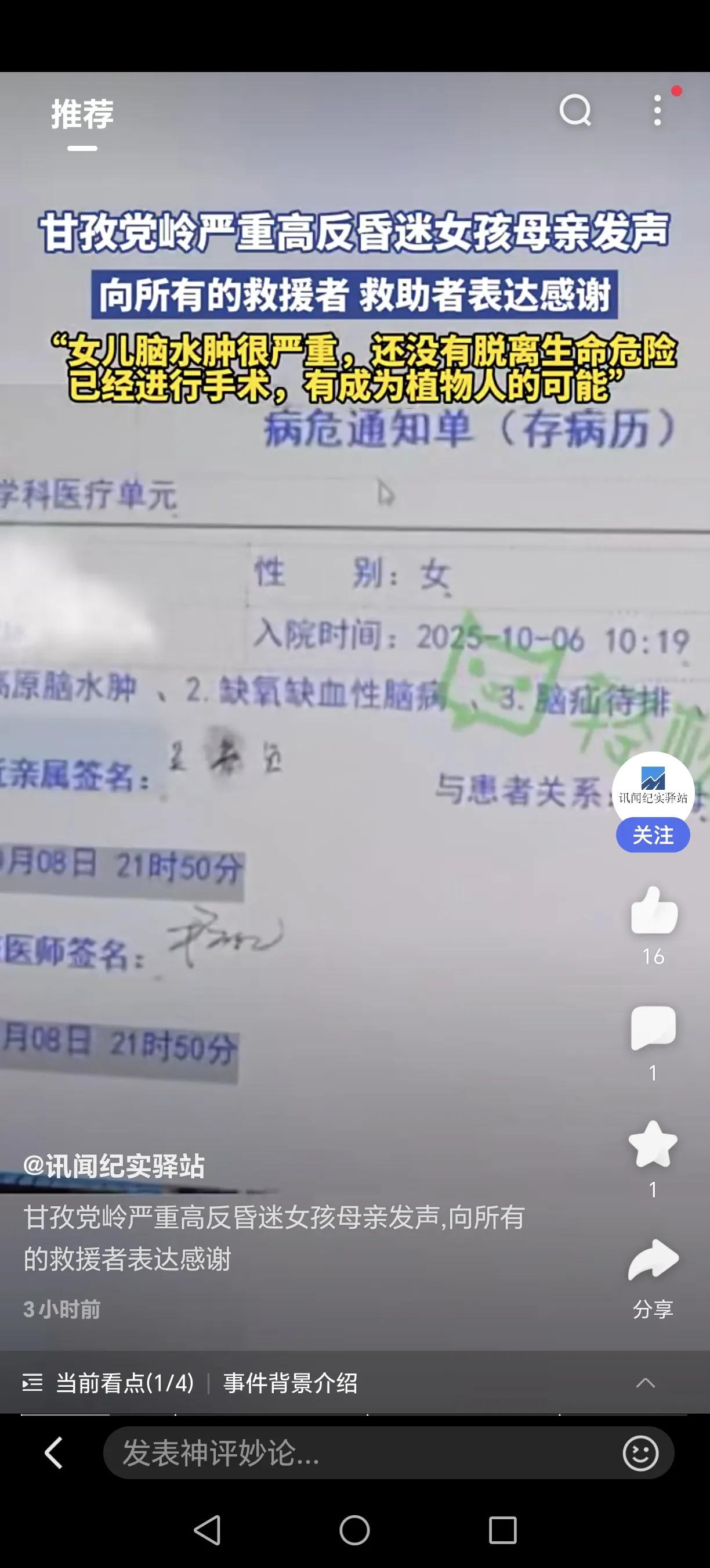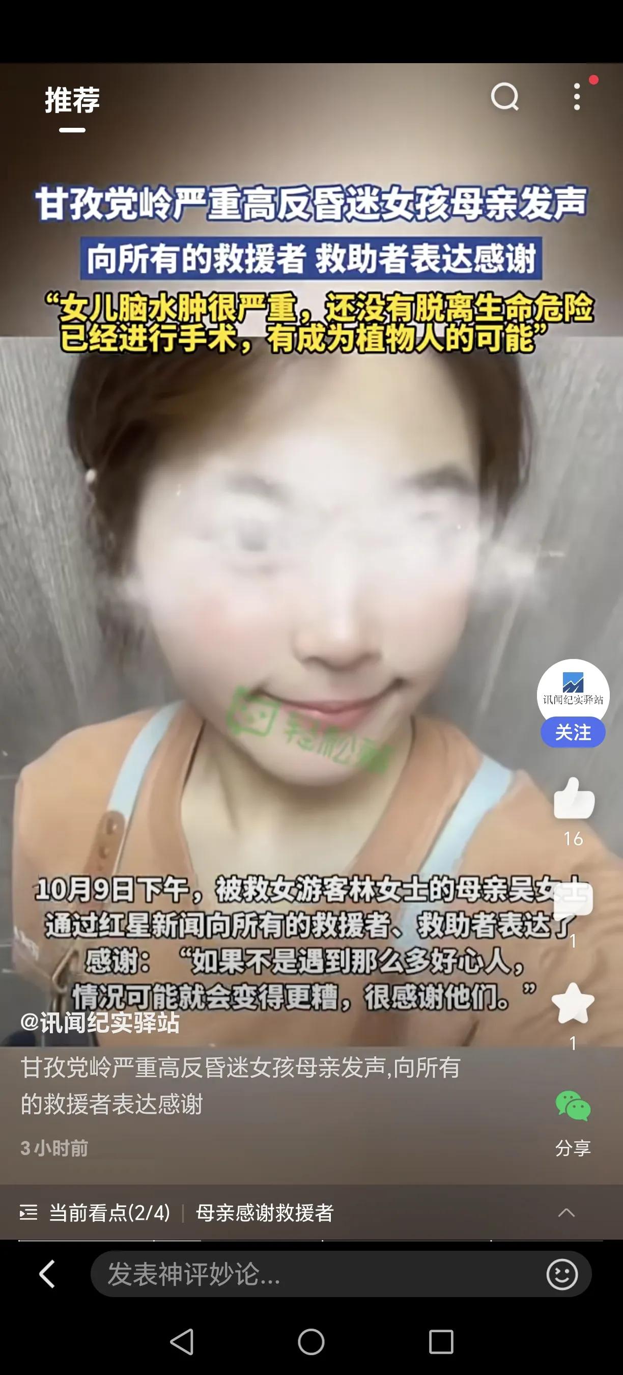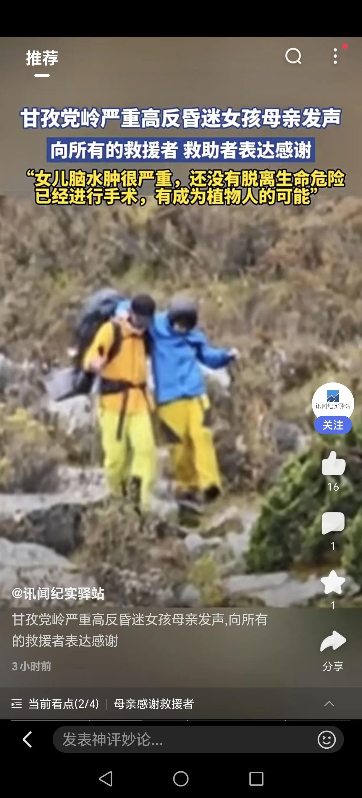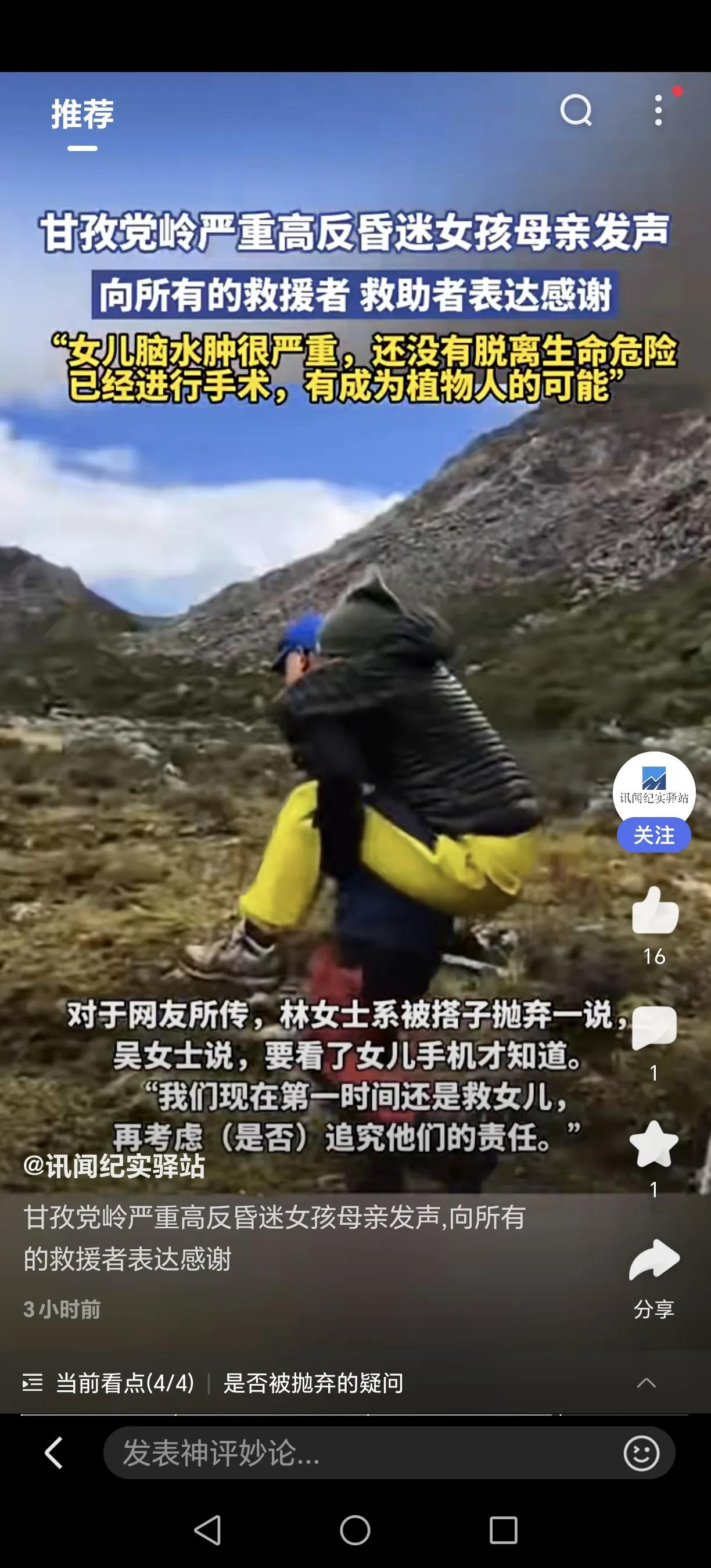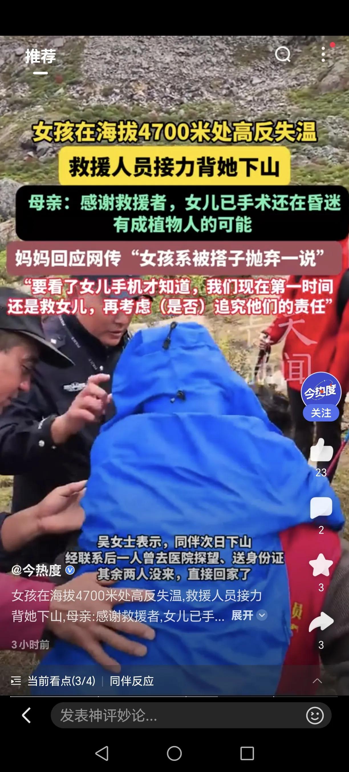 揪心!20岁花季女孩命悬4700米雪山,陌生人的温度改写结局…… 四川甘孜卓雍措湖垭口,一名20岁的江苏女孩独自徒步时突发严重高反应,失温昏迷在茫茫雪山中。危难时刻,素不相识的上海医生、16岁盐城少年、丹巴民警接力救援,用脊背为她撑起生命通道。 女孩被紧急送医后,确诊高原性脑水肿并脑疝,历经手术仍深度昏迷。医生坦言,她面临成为植物人的风险。母亲含泪感谢所有救援者:“没有他们,孩子可能就永远留在雪山上了。” 目前女孩依靠仪器维持生命,医疗费通过筹款解决。一次憧憬已久的旅行,一场改变命运的意外,让我们共同为这个年轻生命祈祷!