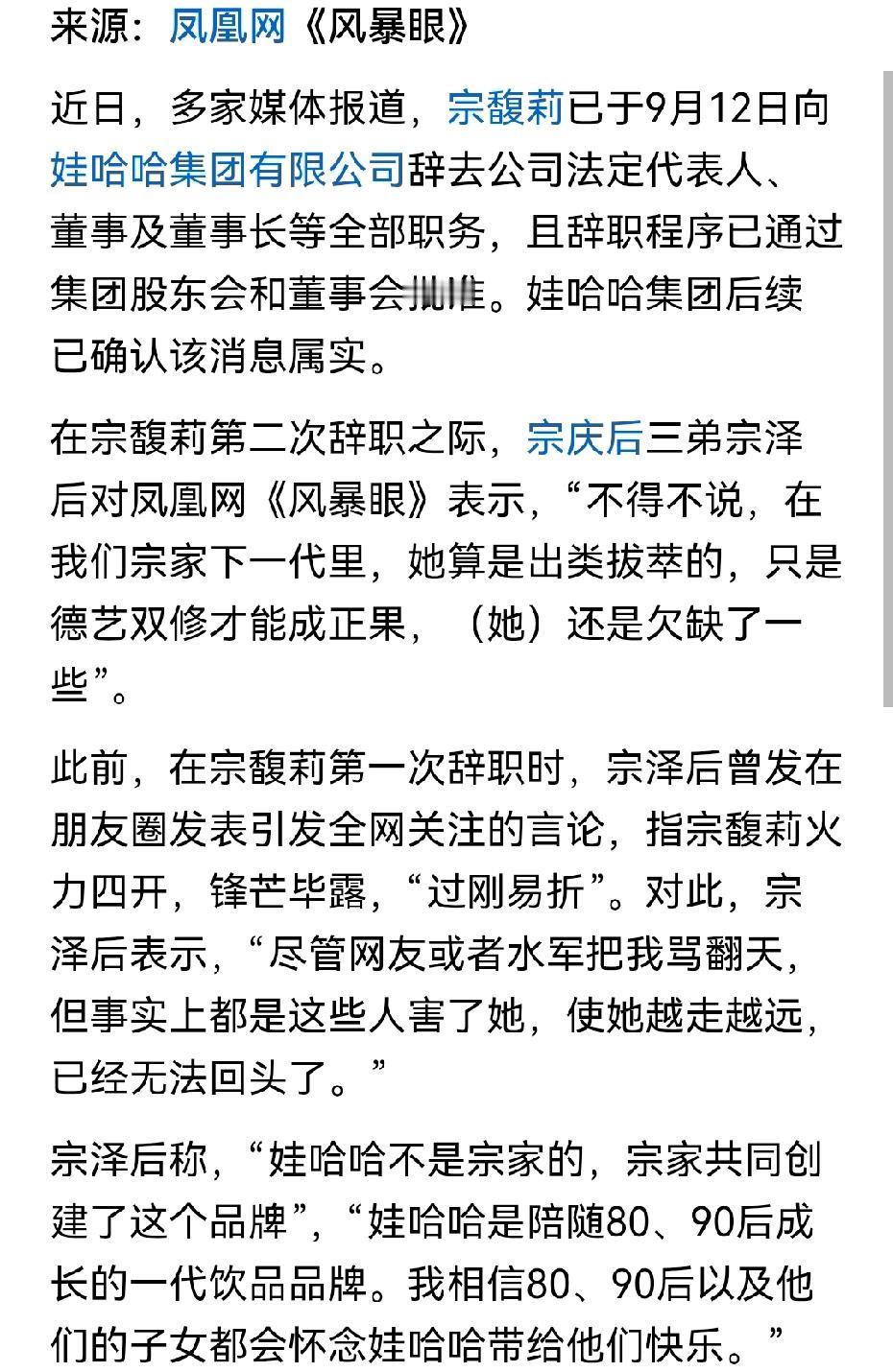 宗馥莉辞职,宗泽后又坐不住了,赶紧出来发声了。 不过他这次比较聪明,没有一上来就骂,而是先肯定了宗馥莉的能力,他觉得宗馥莉比弟弟妹妹们能力强,在宗家的下一代人里能力算出类拔萃,但是要德艺双修才行,意思是宗馥莉有才无德。 宗泽后的这个评价还算中肯,宗馥莉两点是做错了。 一是对待老员工没有像她父亲一样安抚,而是大刀阔斧改革。让有能力者上。弄的那些老员工怨声载道。 二是把宗庆后有私生子女的“丑事”弄的人尽皆知,主要原因是她没有履行父亲的遗嘱。她还是小看她父亲的影响力了,她父亲塌房了,娃哈哈在人们心中也没有以前那么受欢迎了。 大家觉得宗馥莉输了吗?