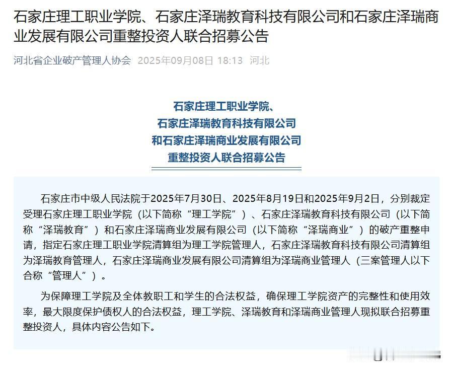 太魔幻了!河北一高校破产重整新生正常报道。近日,河北省企业破产管理人协会发布消息称,石家庄理工职业学院进入破产重整阶段,并面向社会公开招募重整投资人。[允悲][允悲][允悲]