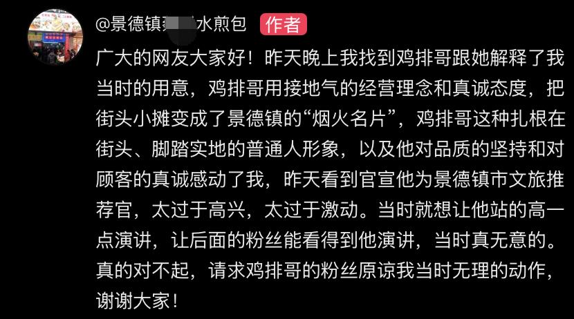 扯鸡排哥衣角男子身份曝光,原来是个同行!当地人都说他人很好! 近日爆火的鸡排哥已经成为景德镇文旅推荐官,这泼天的流量自然也引来了不少人想要蹭一蹭,据媒体报道,在鸡排哥出摊后有一男子走到鸡排哥身边,拉着他的衣服想让他站在矿泉水箱上对着顾客讲两句,不难看出鸡排哥已经很不情愿了,但是男子还是用力拽着鸡排哥的衣服。事后该男子道歉,称自己太激动了,想让粉丝都看得清楚一点,没有恶意,请求鸡排哥的原谅。紧接着男子身份被扒,原来他也是同行,干餐饮的,在当地卖水煎包。不过有当地网友表示,其实这位男子人很好,口罩时期还把店里的存货免费发放给附近的居民帮助了好多人,所以广大网友们,你们原谅这位男子吗?