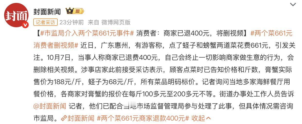 店名曝光避雷!2个菜661元店家官方已明确处理,极有可能会被查封! 近日,广东省惠州市,一男子称旅游点炒蛏子和螃蟹两个菜661元,引起全网热议,目前双方已经基于自愿调解,商家已经退还男子400元,而男子也删除了当初的视频。据悉,这家店曾经在7月份的时候还上架过一款168的套餐,但十一期间却下架了该团购。而针对目前网络的舆论,有关部门已经对其进行调查,照这个情况发展下去,这家店肯定是吃不了兜着走了。因为就在七月份,同样也是在广东,一家海鲜饭店318元套餐最后收费2297元,最终该店铺被彻底查封。所以参考这个处罚力度,661元餐厅大概率也会被查封。