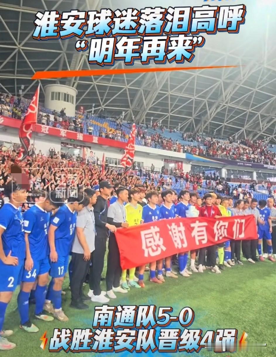 淮安虽败犹荣!(苏超) 球迷哭着呐喊助威,小伙子们累到筋疲力尽,淮安真的没人了吗?太让人心疼了,今晚注定是大淮的不眠之夜,南通真的太强了最终以5:0战胜淮安。 其实南通从一开始,实力就是有目共睹的强,明明是本该毫无悬念的第一名和最后一名的比赛,却让那么多人为第一名担心,看好最后一名,期待奇迹的出现,其实淮安队能进八强已经是个奇迹了,他们值得被尊重。 我们可以看到每个球员踢到最后都是筋疲力尽了,他们全身湿透了,甚至已经分不清脸上是汗水还是眼泪,但是他们依然坚持到最后一刻,没有认输。而观众席上的球迷们也心疼的流下眼泪,还在不停的为球员们呐喊助威。 加油明年再战,十三太保哪个输都不丢人,该疼的时候疼,该浪的时候还要浪起来,那样才符合我们“浪里马”的气势! 如今苏北五虎仅剩盐城最后一虎了,最后的排面,最后的希望啦! 大家对此怎么看?苏超淮安队